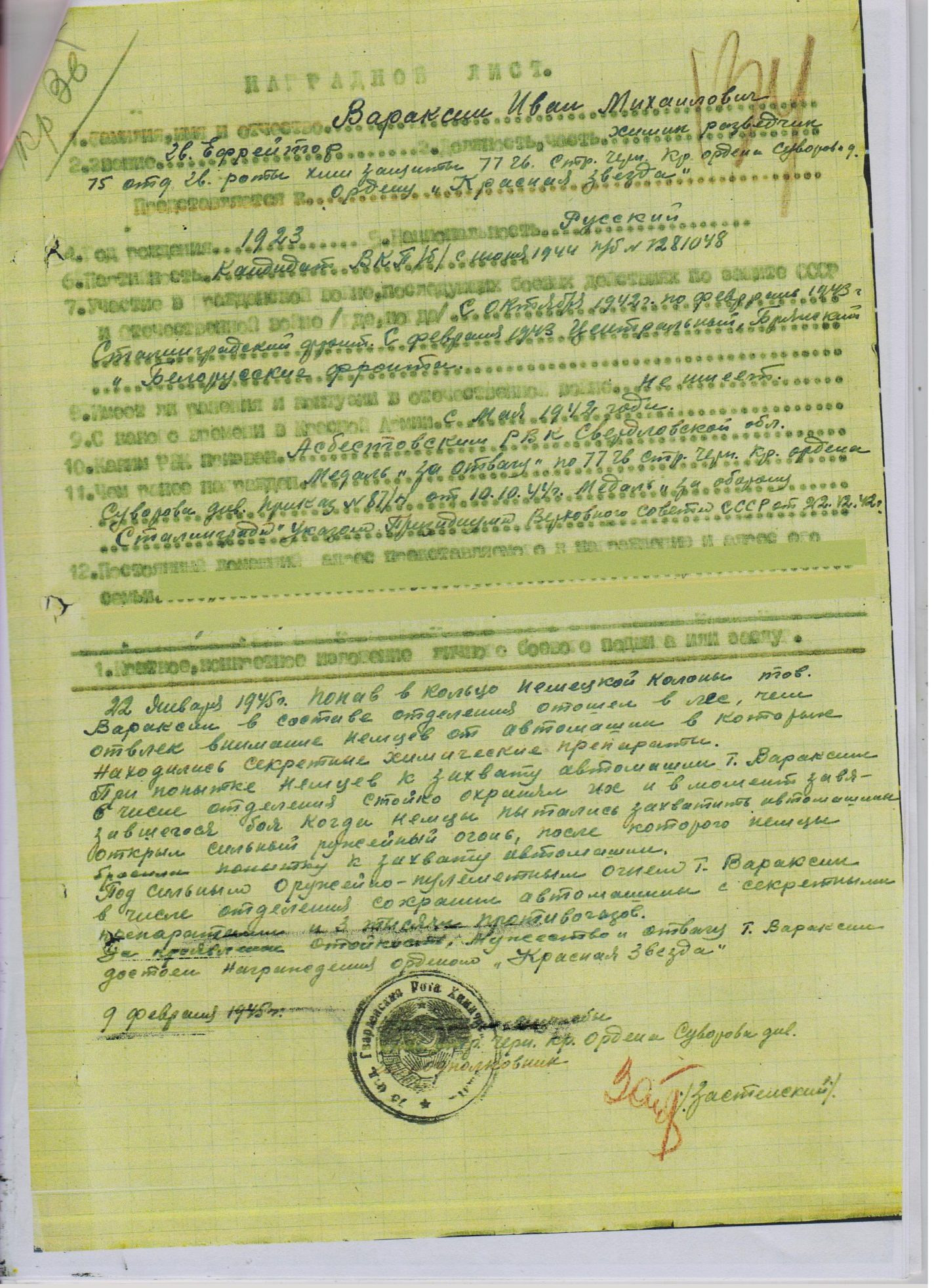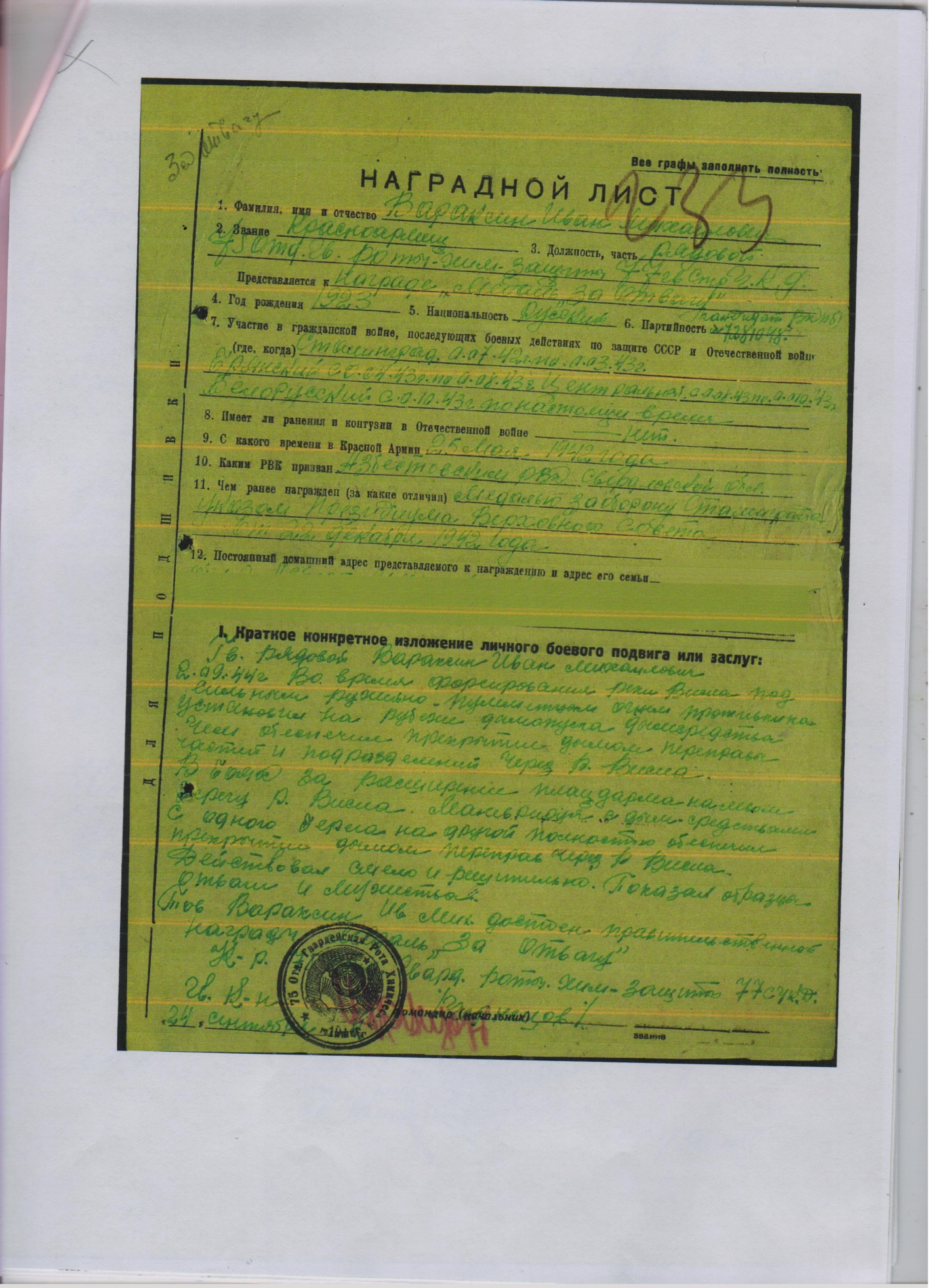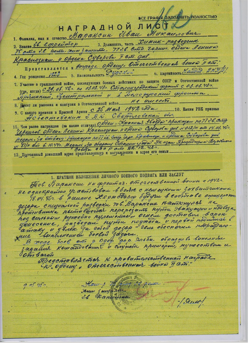 Сталинградом, Брянском и Белорусском фронтах.Награжден:- орденом «Красной