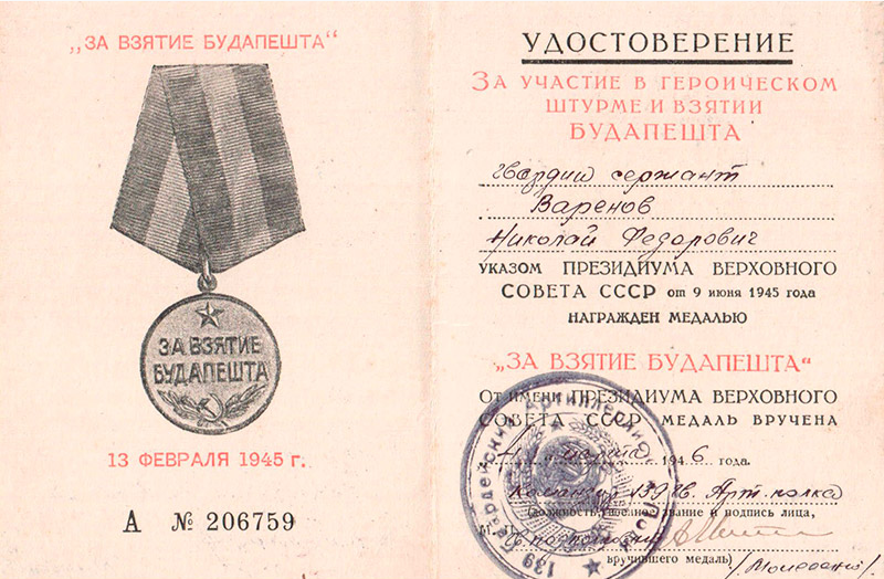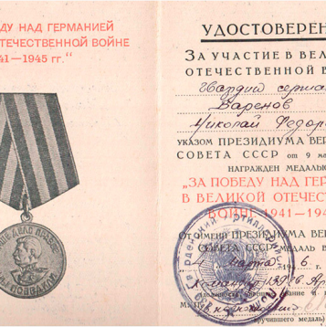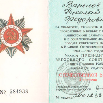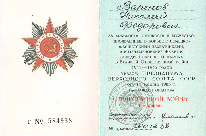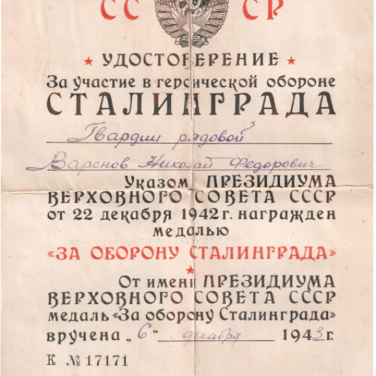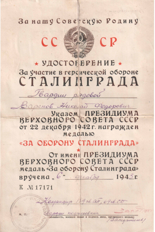 А начиналось все так. Всех юношей, которые учились с Николаем Фёдоровичем, призвали в армию и направили учиться в город Вольск Саратовской области во вторую авиатехническую школу. Но проучиться пришлось только один месяц. В это время начались ожесточённые бои под Сталинградом. Училище расформировали и всех курсантов направили на пополнение 212-ой стрелковой дивизии, понёсшей большие потери в боях. Николай стал связным. Так началась боевая биография Николая Фёдоровича Варёнова.