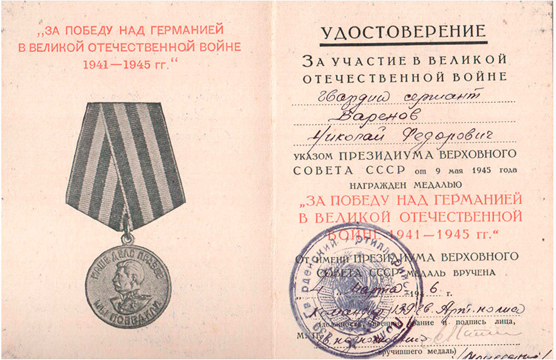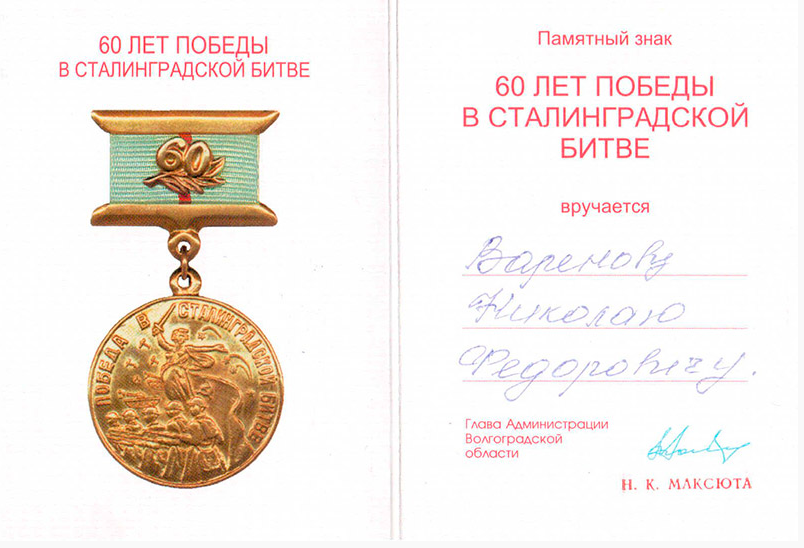За проявленный героизм в боях под Сталинградом полку, в котором воевал Николай, присвоено звание гвардейский, а гвардии сержант Варенов награждён: орденом Отечественной войны II степени, медали «За отвагу», «За оборону Сталинграда», «За взятие Вены», «За взятие Будапешта», «За победу над Германией в Великой Отечественной войне 1941-1945 г.г.».