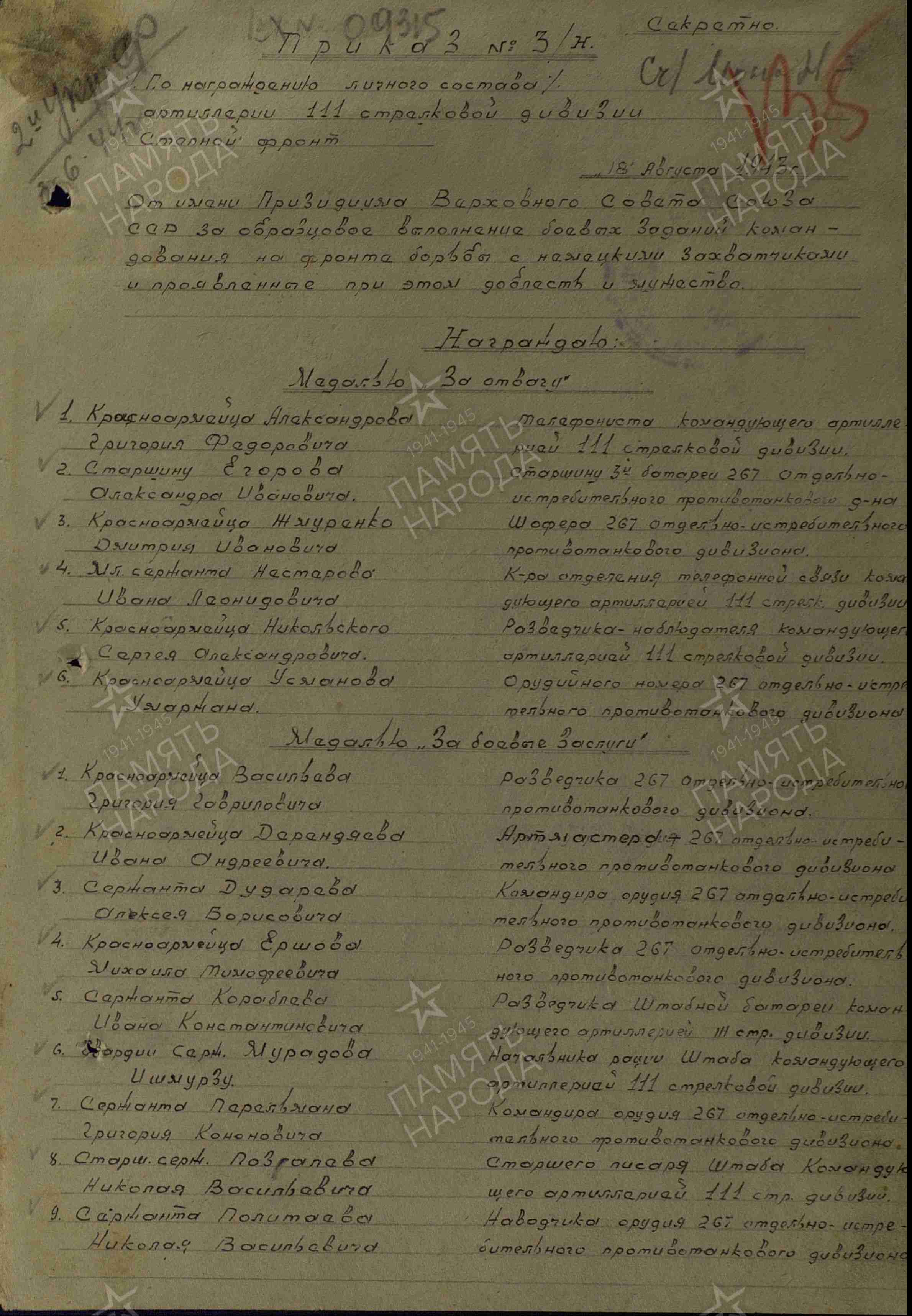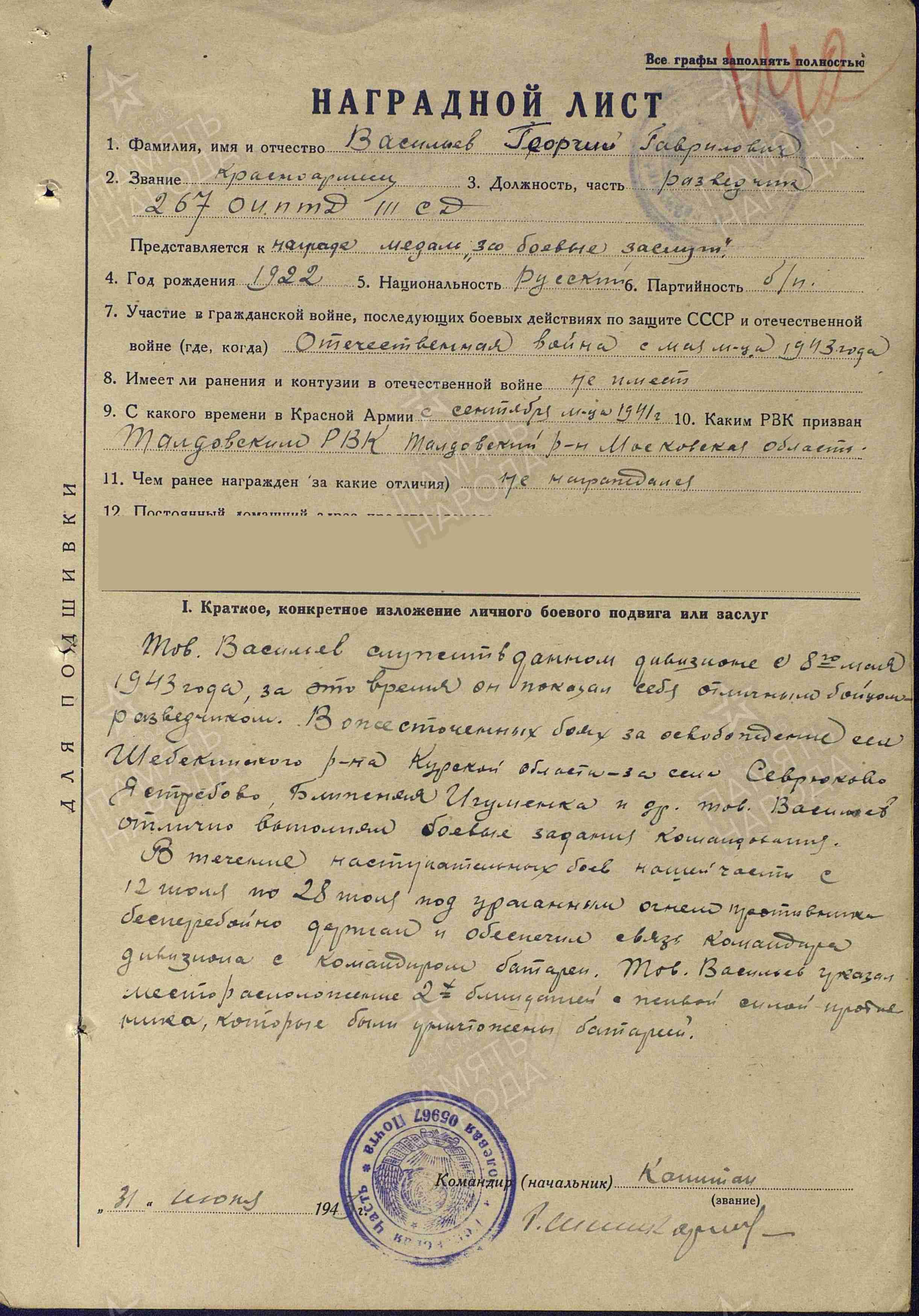 Егор Гаврилович родился в простой крестьянской семье. Мать Анна Ефимовна Васильева родила четверых сыновей, Егор был самым младшим, она его очень любила и называла его Егорушкой. Рос живым, резвым, дерзким парнем. Получил профессию слесаря. Двое из старших братьев так же участники Великой Отечественной войны, оба вернулись с войны в свои семьи, воспитали детей, а Егор был призван совсем юным и не успел завести семью. Старший брат Александр во время войны был офицером НКВД. Егор был призван в Красную армию в сентябре 1941 года, в 1943 году участвовал в освобождении Шебекинского района Курской области от немцев, был разведчиком, звание - сержант, командир отделения, 267 отдельный истребительно-противотанковый дивизион 111 стрелковой дивизии. В течении наступательных боёв с 12 по 28 июля под ураганным огнём противника бесперебойно держал и обеспечивал связь командира дивизиона с командованием батареи. Как разведчик указал место расположения блиндажей с живой силой противника, которые были уничтожены нашей артиллерией. В сентябре 1944 года участвовал в освобождении Румынии, получил сквозное пулевое ранение 7 сентября, умер 15 сентября в военном госпитале г. Яссы, где был похоронен с отдачей воинских почестей на кладбище Святого Василия, участок госпиталя, могила № 9.
