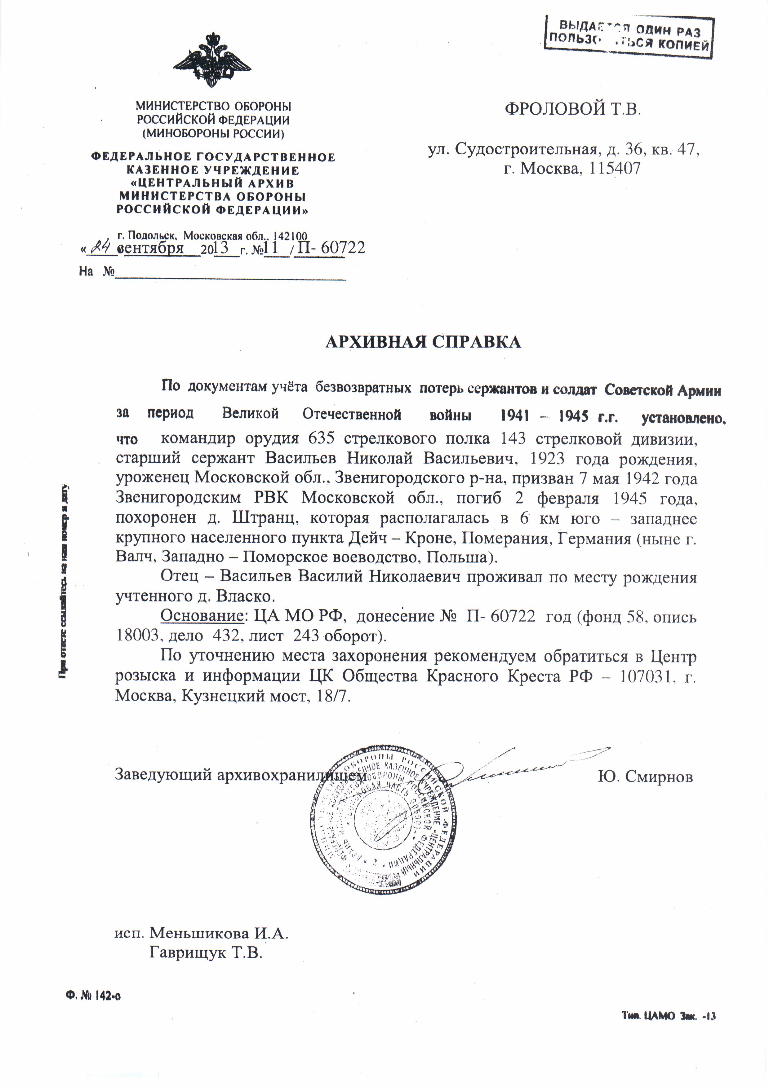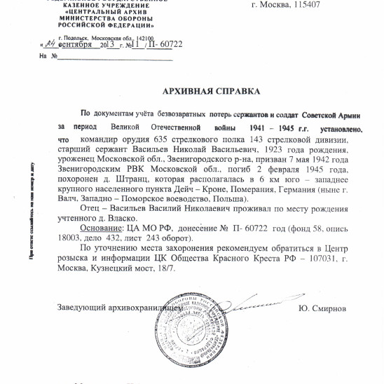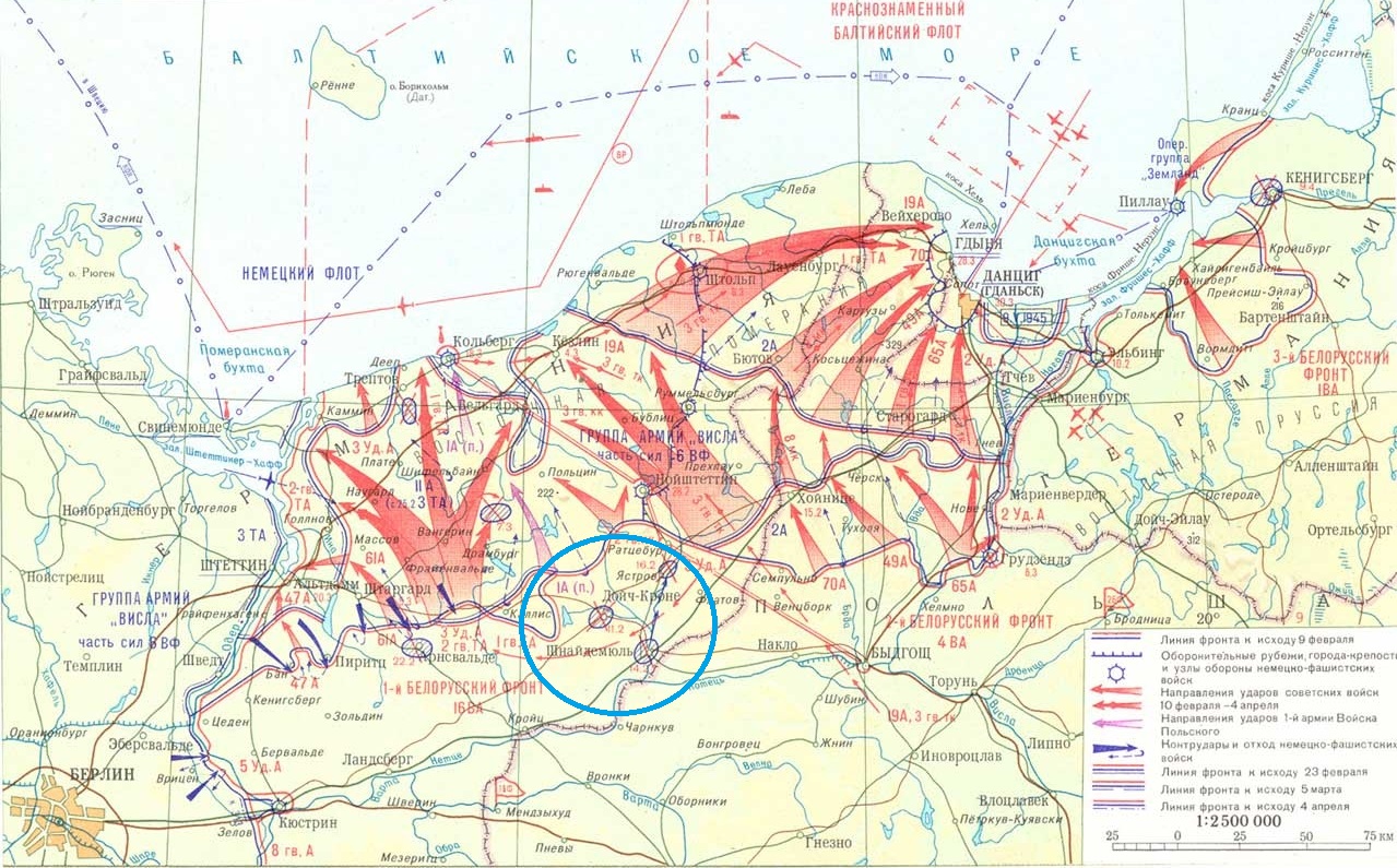 Это была Висло-Одерская операция по освобождению Польши от немецких захватчиков. К 1 февраля войска 1-ого Белорусского фронта под командованием Жукова вышли к реке Одер и со 2 февраля завязали упорные бои по прорыву укреплённых позиций фашистов.Бои были очень тяжёлые. Но 11 февраля 1945 года наши войска сломив упорное сопротивление фашистов овладели городом Дёйч-Кроне, где погиб мой дядя. Эти скудные сведения были найдены членами моей семьи в Книге памяти и в интернете. Я давно хотела найти место, где погиб и похоронен мой дядя, которого я никогда не видела, т.к. родилась через 13 лет после Победы. Я обратилась в Центральный архив Министерства обороны РФ, где по документам учёта безвозвратных потерь сержантов и солдат Советской Армии за период Великой Отечественной войны 1941-1945 годов подтвердили сведения из интернета.