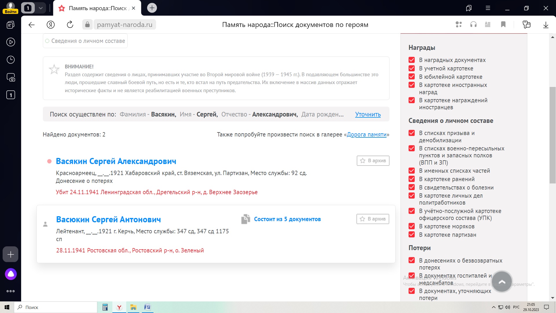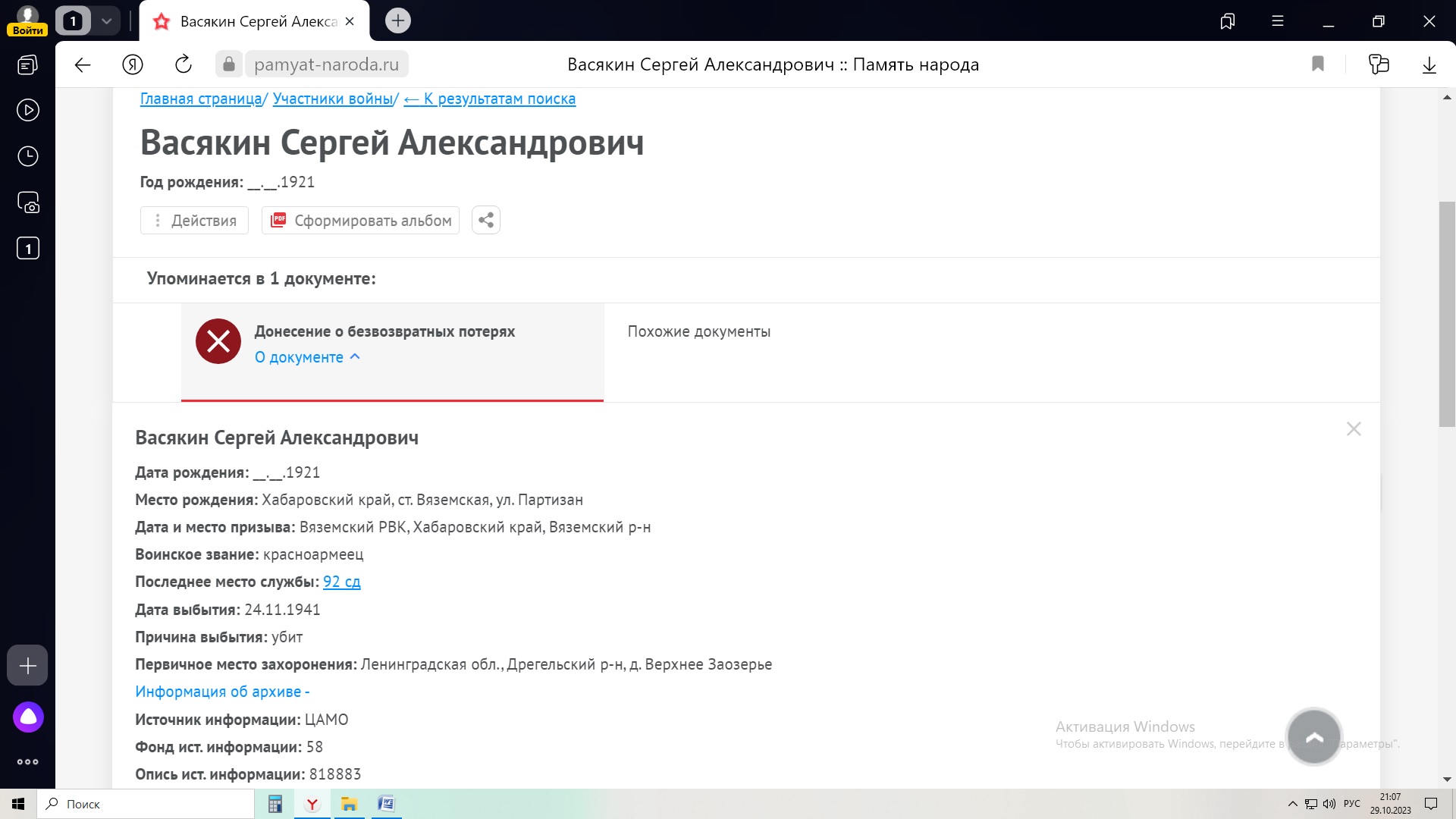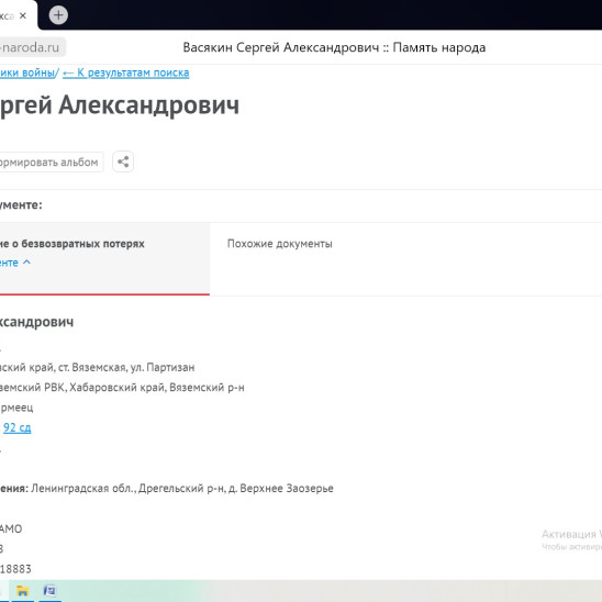 Васякин Сергей Александрович родился в 1921 году, в Хабаровском крае, станция Вяземская. С началом Великой Отечественной войны был призван в ряды Рабоче-Крестьянской Красной армии Вяземским райвоенкоматом. Сергей Александрович воевал рядовым красноармейцем-стрелком. Воевал в составе 92 стрелковой дивизии,4 Армии, которая была сформирована из дальневосточников и приняла на себя самые кровопролитные сражения в первый год Великой Отечественной войны. О тяжести боев и потерь говорит такой лишь факт: к марту 1942 года, участвуя в боях за прорыв второй оборонительной позиции противника на участке Михалево – Остров, 92 стрелковая дивизия понесла такие серьёзные потери, что была сведена в один, 317-й стрелковый полк. Васякин С.А.. погиб в бою 24 ноября 1941 года. Сегодня благодаря поисковикам из Великого Новгорода мы знаем, что это произошло в ходе тяжёлых боев за Рёконьский монастырь, находящийся на территории Любытинского района. В списке погибших в том бою солдат значится 876 фамилий, в том числе 9 из Хабаровского края. Останки Сергея Александровича Васякина найдены в мае 2023 года у деревни Верхнее Заозерье Любытинского района в ходе поисковых работ, идентифицированы. Вечная память Солдату Васякину С.А. !!!!