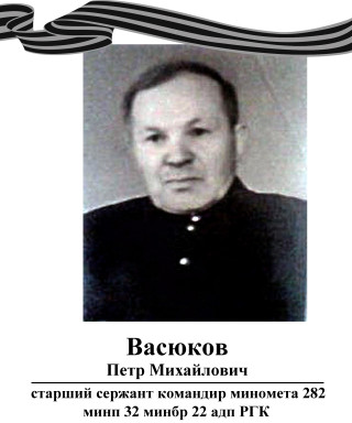 Васюков Петр Михайлович 02.09.1902 Рязанская область Ерахтурский район д. Павловка Специальность до призыва: - председатель колхоза Участвовал в Великой Отечественной войне с июня 1942 по май 1945 года В составе 611 стрелкового полка – стрелок В составе 26 танкового полка -наводчик В составе 1538 самоходного полка – наводчик В составе 282 минометного полка – командир миномета Ранения: - тяжело ранен в сердце 04. 08. 1942г. - ранен в голову – 29.04. 1944 г. Окончил войну в звании старшего сержанта Награды: - орден Красной Звезды - медаль «За Отвагу» - медаль «За Победу над Германией» - юбилейными медалями