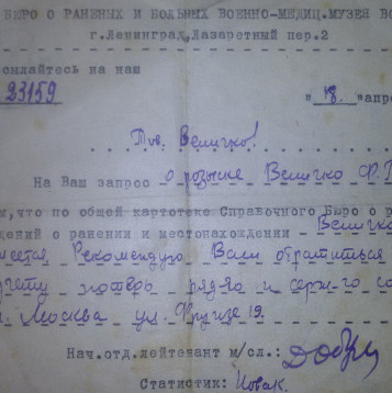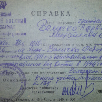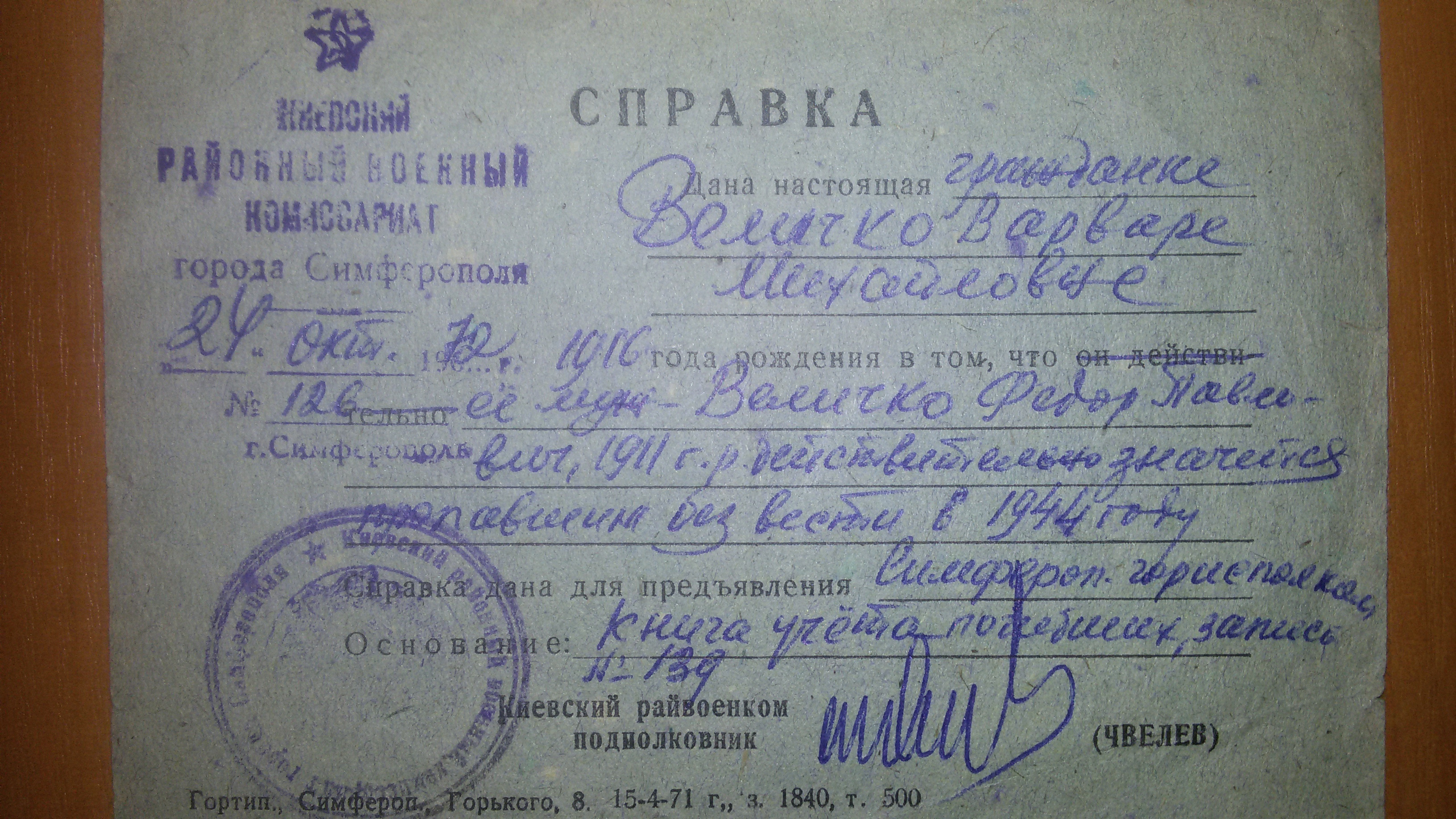 Началась война, Величко Федор Павлович был призван на фронт 25.06.1941 года Симферопольским ГВК, Крымской АССР, города Симферополя, как рядовой – шофер и находился при эвакогоспитале №1751 в городе Симферополе. Эвакогоспиталь эвакуировался 31 октября 1941 года, отец также эвакуировался вместе с госпиталем. Больше сведений о нем нет. Знаю со слов матери, что после войны к ней пришел сослуживец отца и рассказал, что 7 ноября 1941 года
