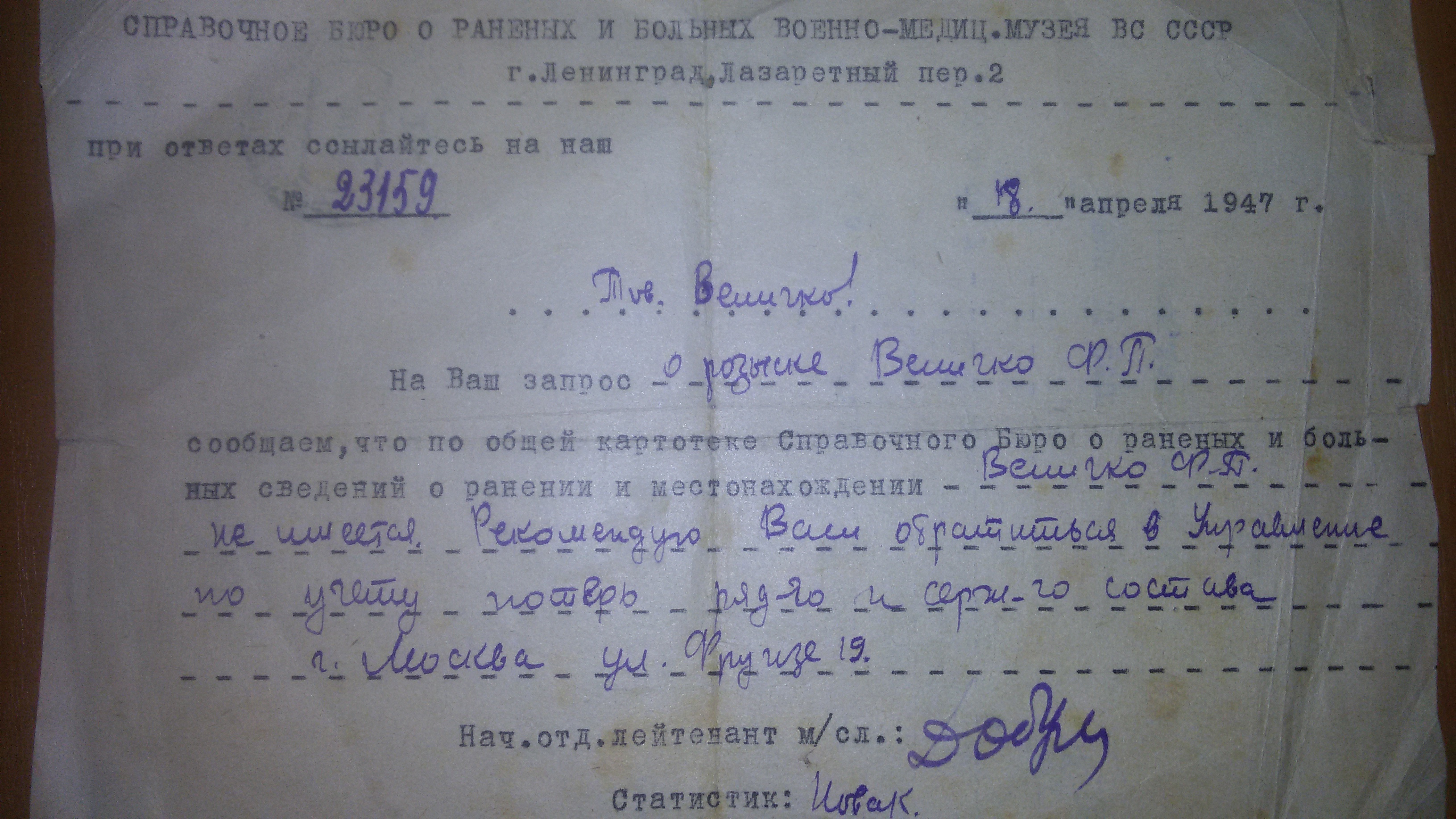 После войны мама писала запросы в Ленинград и в Москву, чтобы выяснить судьбу моего отца. В ответах было указано, что он числится пропавшим без вести. Знаю по данным ОБД "Мемориал", что папа с ноября 1941 года также числится пропавшим без вести, ему было 30 лет!