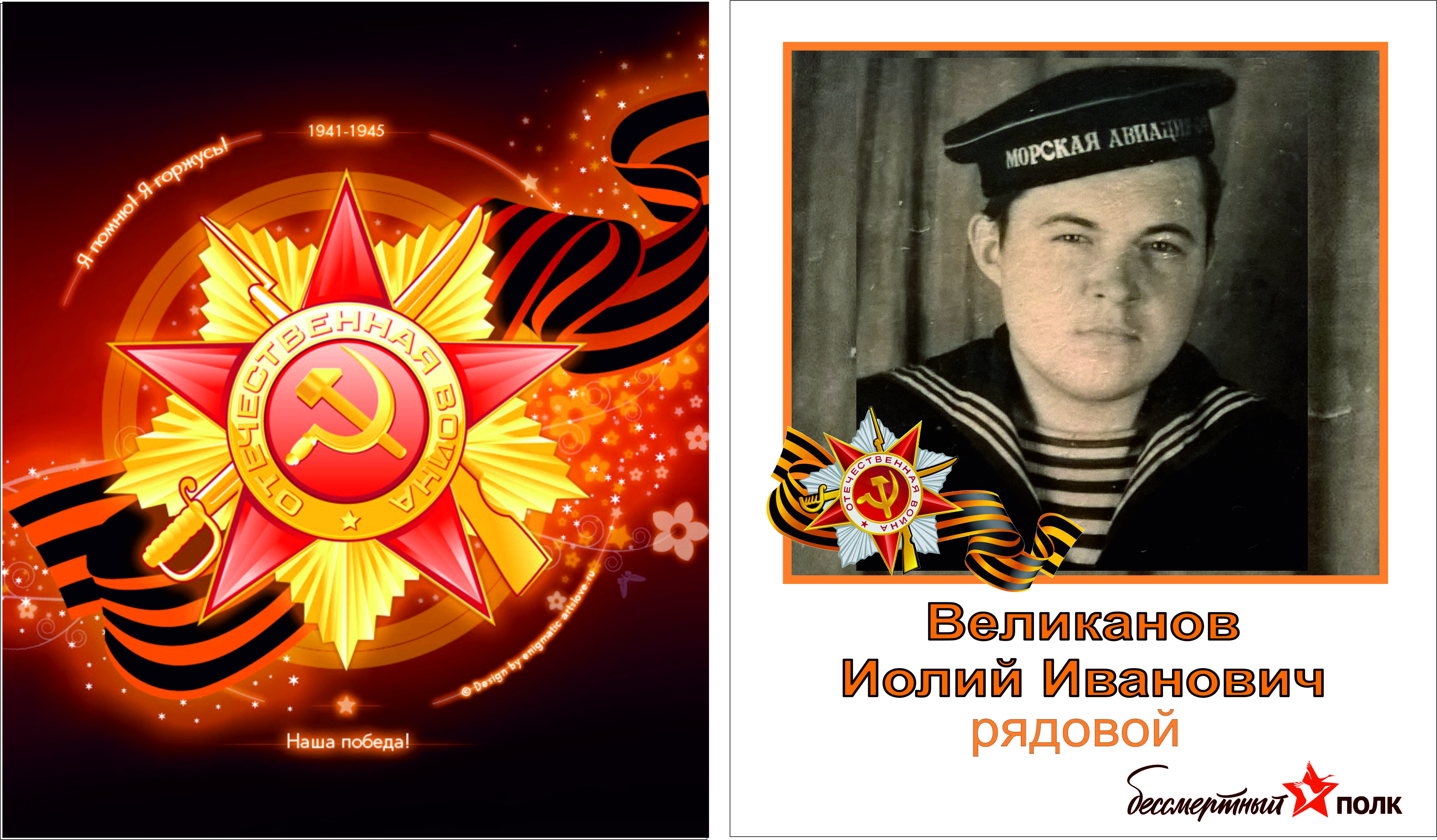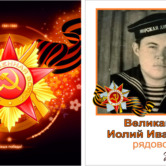 Великанов Иолий Иванович родился 02 ноября 1924 года в селе Суромна, Суздальского района, Владимирской области. С августа 1942 года по март 1944 год служил строевым 16-й авиабазы военно-воздушных сил Северного флота (ВВС СФ), с марта 1944 года по апрель 1946 года служил строевым 15-й авиабазы ВВС СФ, а с апреля 1946 года по март 1948 года служил стрелком авиатехнического батальона 15-й авиабазы ВВС СФ. Воспитывал сына и дочь, а также 2-х внуков и внучку. Умер 20 июля 1996 года в возрасте 72 года.