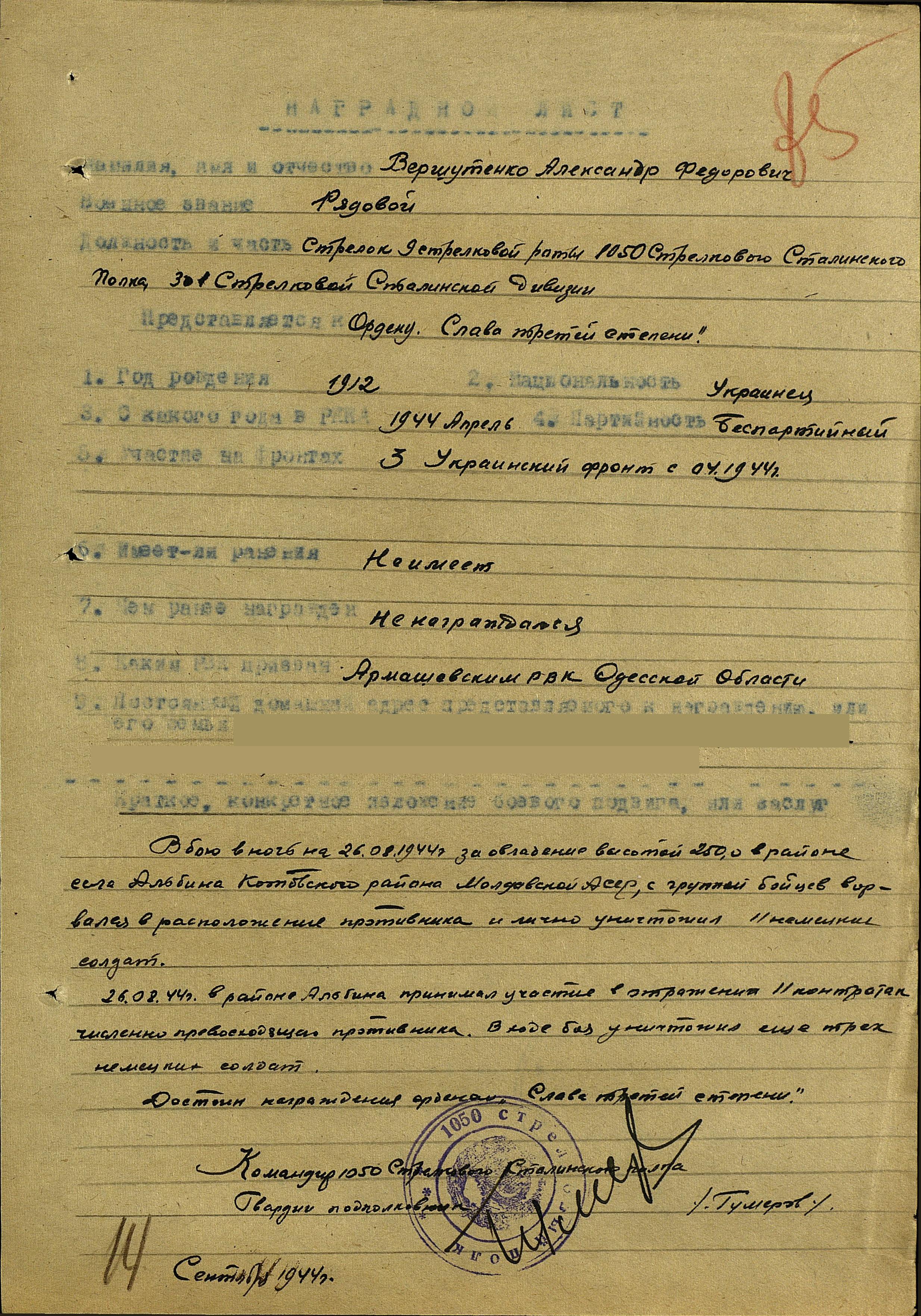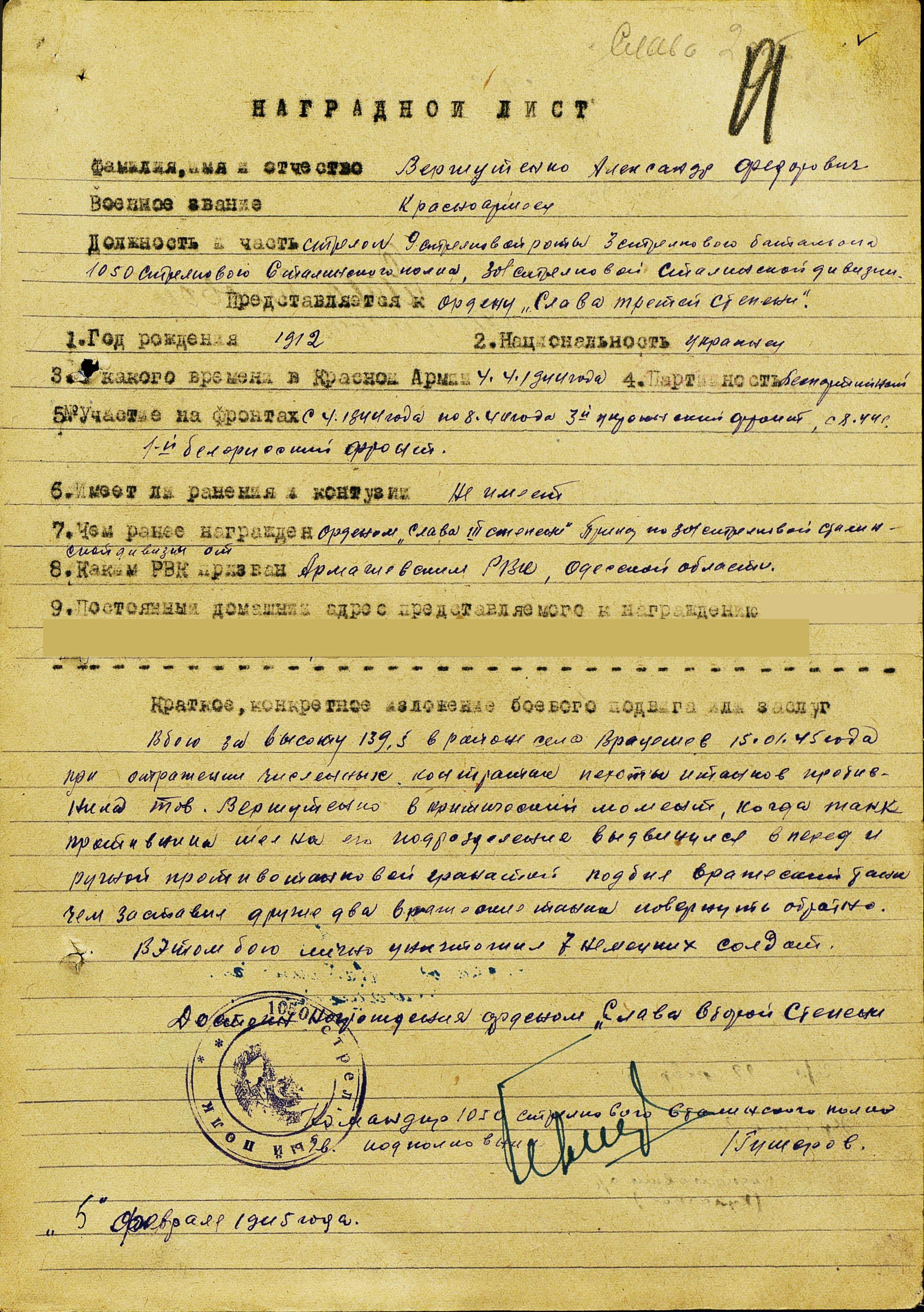 Федорович Вершутенко. За этот бой он был удостоен ордена Славы 3 степени. Из