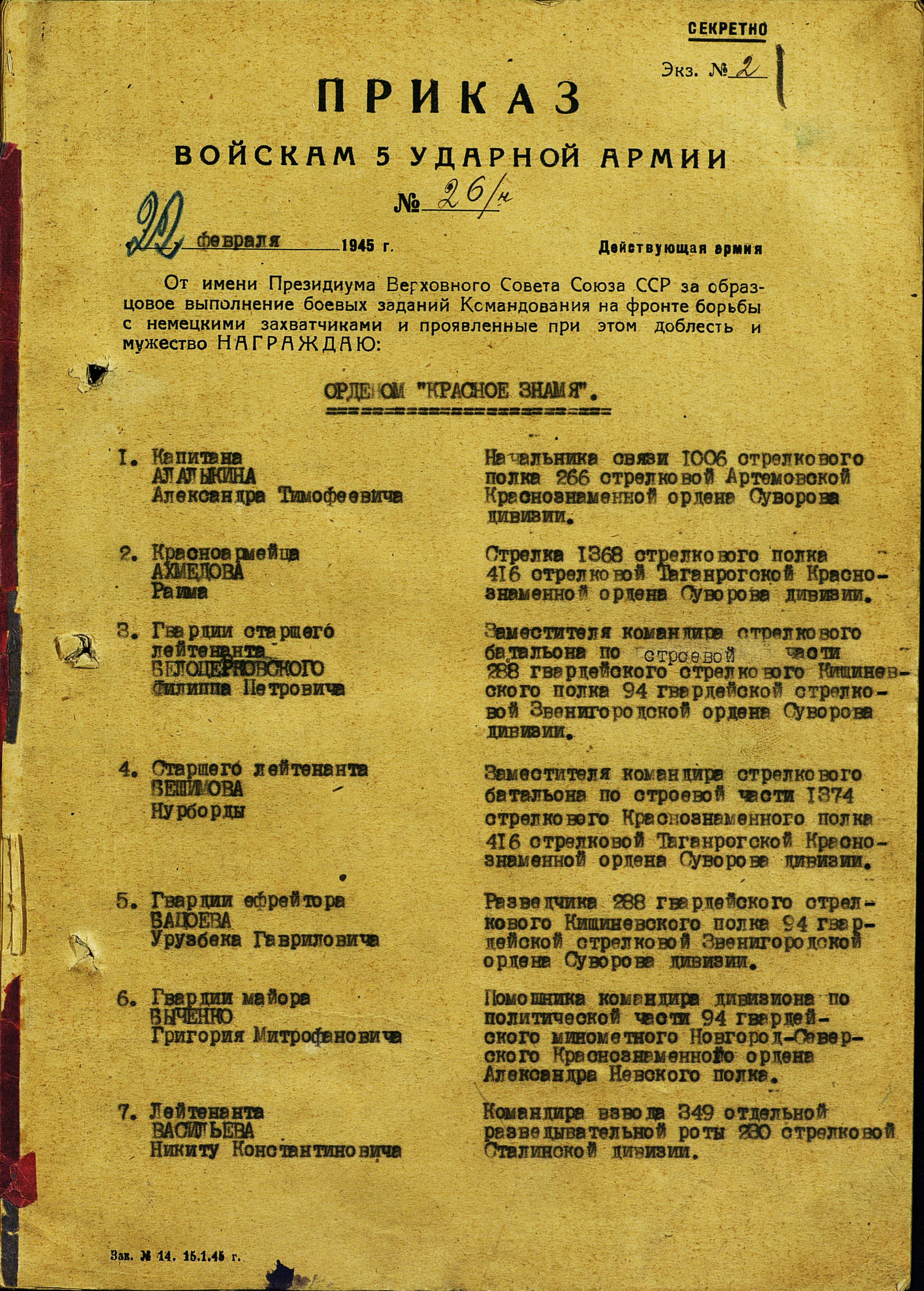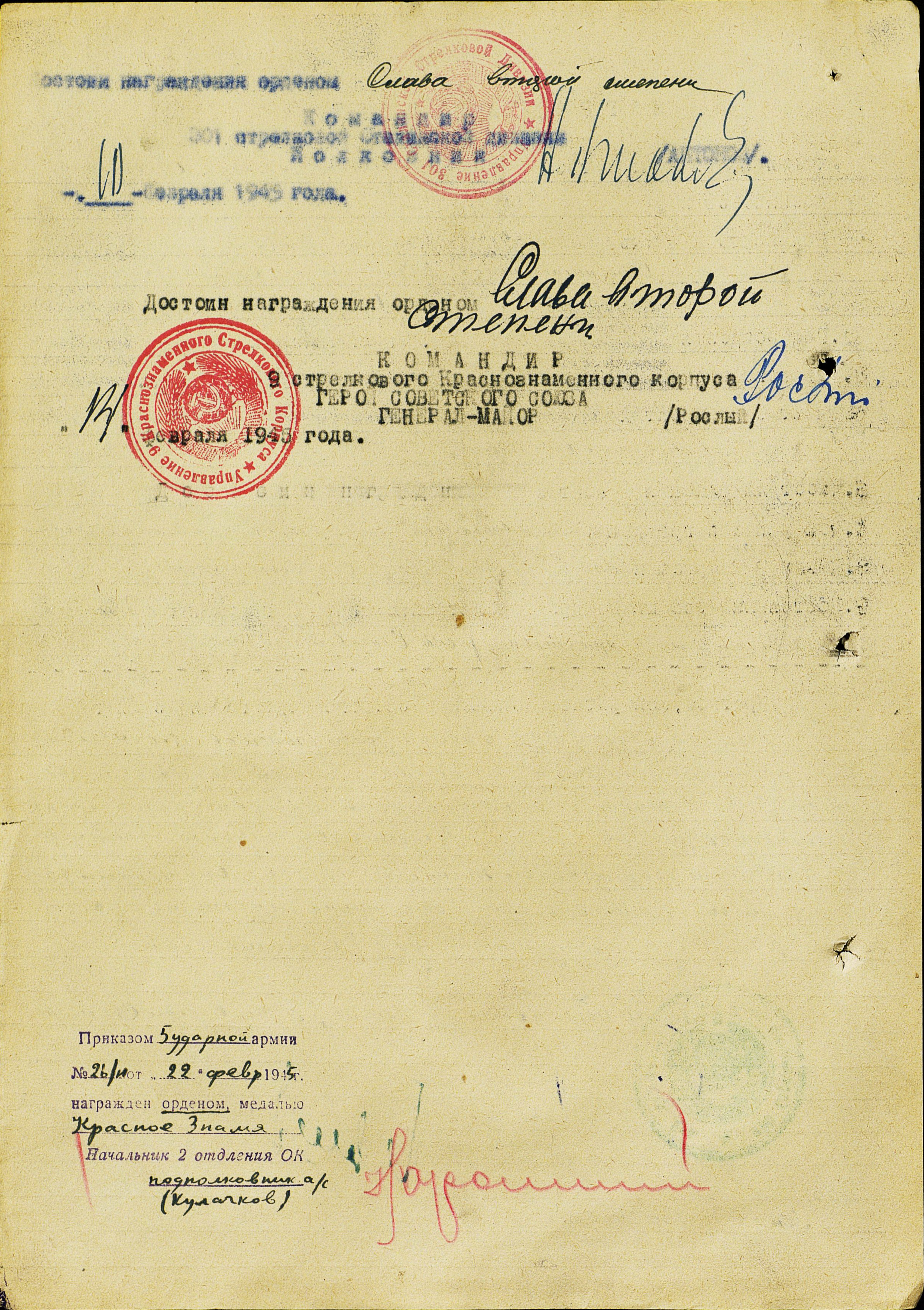 награждения орденом Слава второй степени». Но командование 5-ой ударной