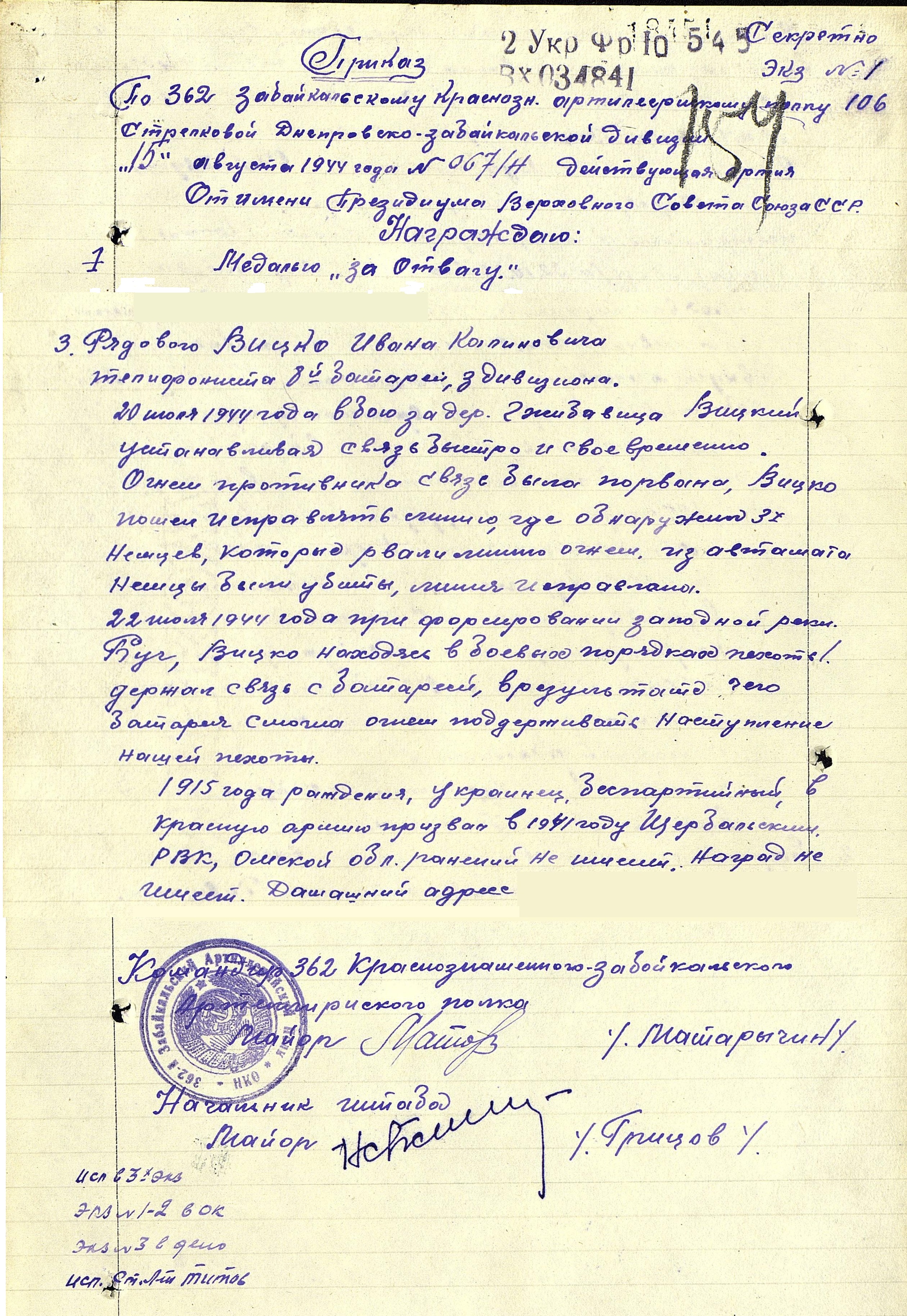 Вицко Иван Калинович был призван в ряды РККА еще в сентябре 1937 года. Служил в звании оружейного мастера в 121 кавалерийском полку до октября 1939г и был уволен с запас. Но уже в мае 1941г был призван по мобилизации Щеибакульским РВК был определен в 51 пограничный отряд командиром отделения. В октябре 1942г был переведен в 362 артиллерийский полк 106 стрелковой дивизии (II) и дошел в данном воинском формировании до окончания войны. Уволен в запас в декабре 1946года. Был участником Финской войны и Японской войны. Сын и внук участников Первой мировой войны. Брат Вицко Петра Калинковича, погибшего при обороне Москвы в ВОВ.