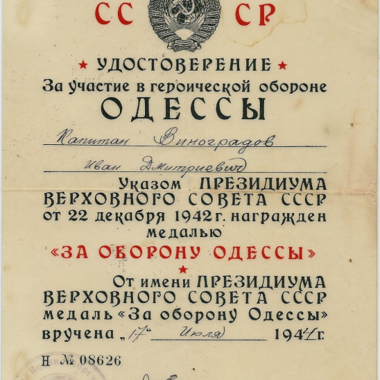 Боевой путь ветерана Мой дедушка был военным комиссаром 3 батальона 9 бригады морской пехоты Черноморского флота. Принимал участие в боях 1941 года на крейсере "Червона Украина" на Тендеровской косе, на Керченском полуострове, в обороне Одессы и Очакова. В октябре 1941 года был тяжело ранен в левую руку.