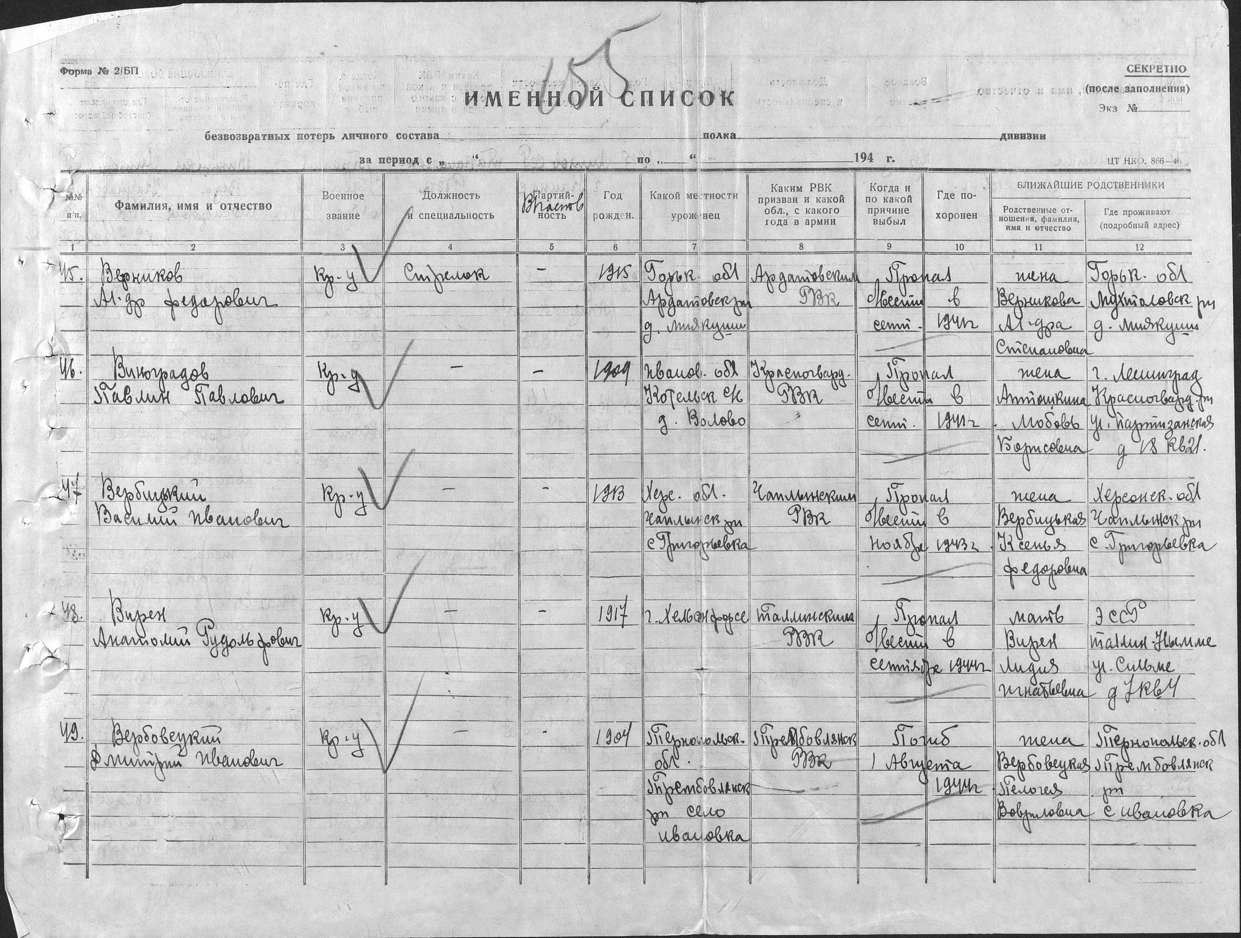 Дата призыва 01.01.1941 г., Место призыва: Красногвардейский РВК, Ленинградская обл., Красногвардейский р-н. Проживал с семьёй до призыва в армию: Ленинградская обл. (г.Ленинград), Красногвардейский район, ул. Партизанская, д. 18, кв. 21.