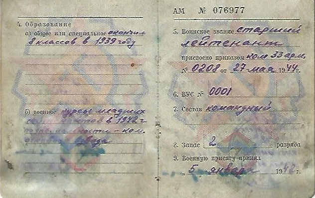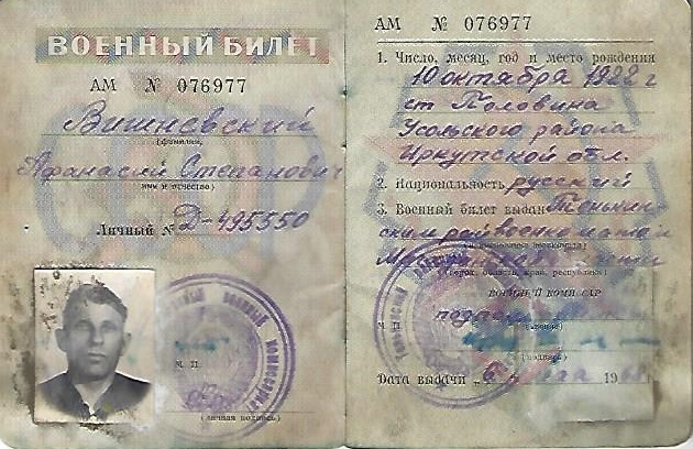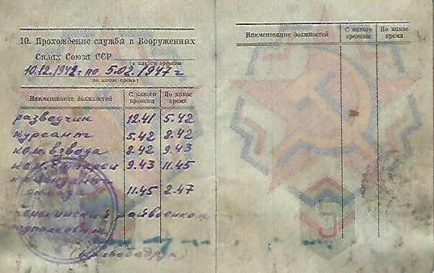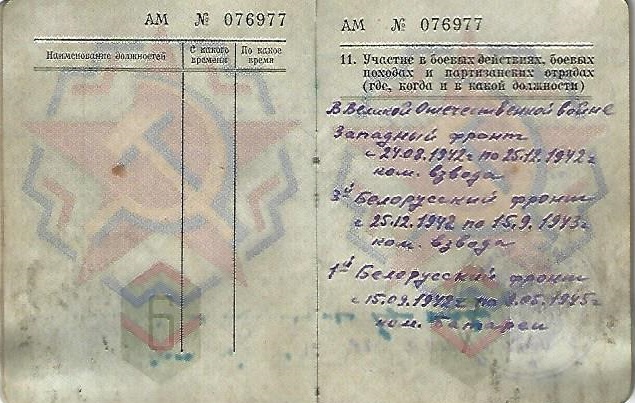 Место призыва Ленинский РВК, Иркутская обл., г. Иркутск, Ленинский р-н Воинское звание: старший лейтенант Дата призыва: 10.12.1941 Воинская часть: 33 армия, 8 гвардейская армия 448 стрелковый полк 397 стрелковой дивизии (II) 128 стрелковая бригада, 329 сп 70 сд, 329 сп Разведчик с дек.41 по май 42, курсант май 42 по авг 42 в Западном фронте, ком. Взвода с авг 42 по сен. 43 в Белорусском фронте, ком батареи сен 43 по ночб 45, комендант склада нояб. 43 по фев. 47 Последнее место службы: 329 сп 70 сд Дата выбытия: 30.08.1944, Дата выбытия: 05.09.1944 Причина выбытия: выбыл в часть/госпиталь Госпиталь: СЭГ 290 Последнее место службы: 329 сп Дата выбытия: 16.09.1944 Причина выбытия: выбыл в часть/госпиталь Госпиталь: ГЛР 3335 Дата выбытия: 18.10.1944 Причина выбытия: выбыл в часть/госпиталь Госпиталь: ЭГ 3397 Причина выбытия: выбыл в часть/госпиталь Госпиталь: ГЛР 347 Награжден: за оборону Москвы, за взятие Берлина, за победу над Германией Работал в 1994 году рабочим свалки в спецавтохозяйство п. Омсукчан Проживал в Магаданской области, п. Омсукчан, ул. Мира, д. 30а, кв. 51 Есть племянница Емельянова валентина Петровна, Иркутская область, Усольский р-он, с. Милелевка, ул. Лесная, д. 8/6 Проходил лечение в санатории «Снежная Долина в 1996 году. И в 1997 г. Поступил в учреждение: 08.06.1995г Умер:29.09.2000г.