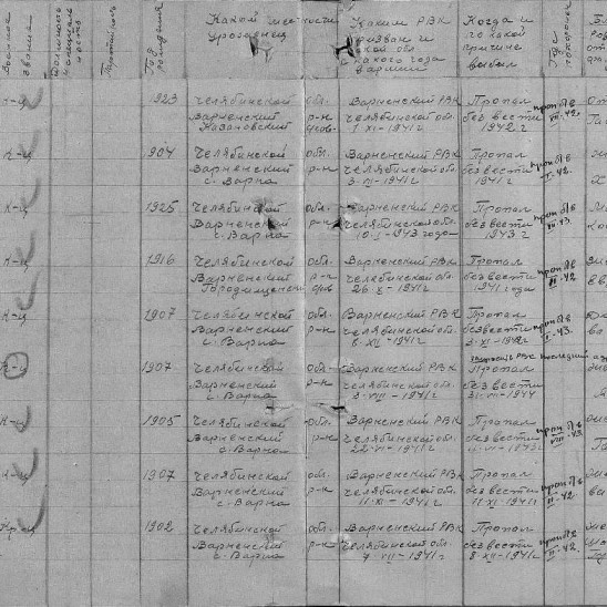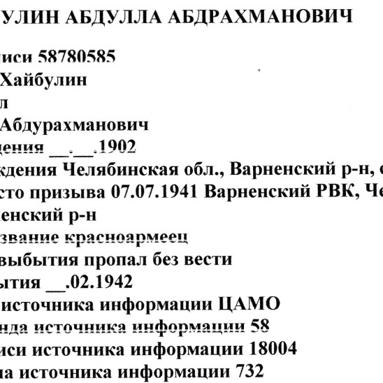 Абдулла Абдраханович Хайбуллин был призван на фронт Варненским РВК 07.07.1941года(со слов дочери 12.09.1941г). Дома остались жена Шамши Гимрановна,1902года рождения и трое детей-Магмура,Габдрауф,Танзиля.С фронта пришло одно письмо,что находятся под Москвой.В феврале 1942года пропал без вести.В настоящее время дальнейшая судьба и место захоронения не известны.Удалось найти документы Варненского РВК Челябинской обл. от 29.11.1946г донесения послевоенного периода,подтверждающие ,что числится в пропавших без вести.