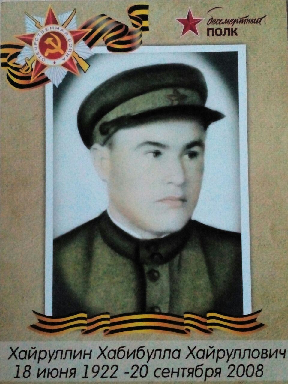 Родился 18 июня 1922 года в Татарстане в Апастовском районе в деревне Малые Болгары. В возрасте 19 лет призвался в армию. Служил на 1 Украинском, на 2 Белорусском фронтах. Участвовал в освобождении от фашистов Украины, Белоруссии, Венгрии, Чехословакии, Румынии, Польши, Бессарабии. Был ранен в голову и в ногу. Лечился в Тифлисском госпитале. Великую Победу встретил в Праге. В мае 1945 года по приказу командования был направлен в Маньчжурию для борьбы с японсками интервентами. Домой возвращается в ноябре 1947 года. Награждён: Орденом Красной Звезды, Орденом Великой Отечественной войны; медалями: "За отвагу!", "За победу над Германией!", "За освобождение Будапешта!", "За освобождении Вены!", "За освобождение Праги!", "За победу над Японией!" и множеством других наград.После войны всю жизнь трудился в кузнице. Изготовлял детали для техники и для хозяйства. Был ударником труда. Был избран депутатом местного районного совета. Работал в колхозе "Татарстан". Воспитал вместе с прабабушкой семерых детей. Скончался в возрасте 86 лет в кругу любящих его детей. Спасибо, дедушка, за то что мы живём под мирным небом и не знаем войны!Вечная память...