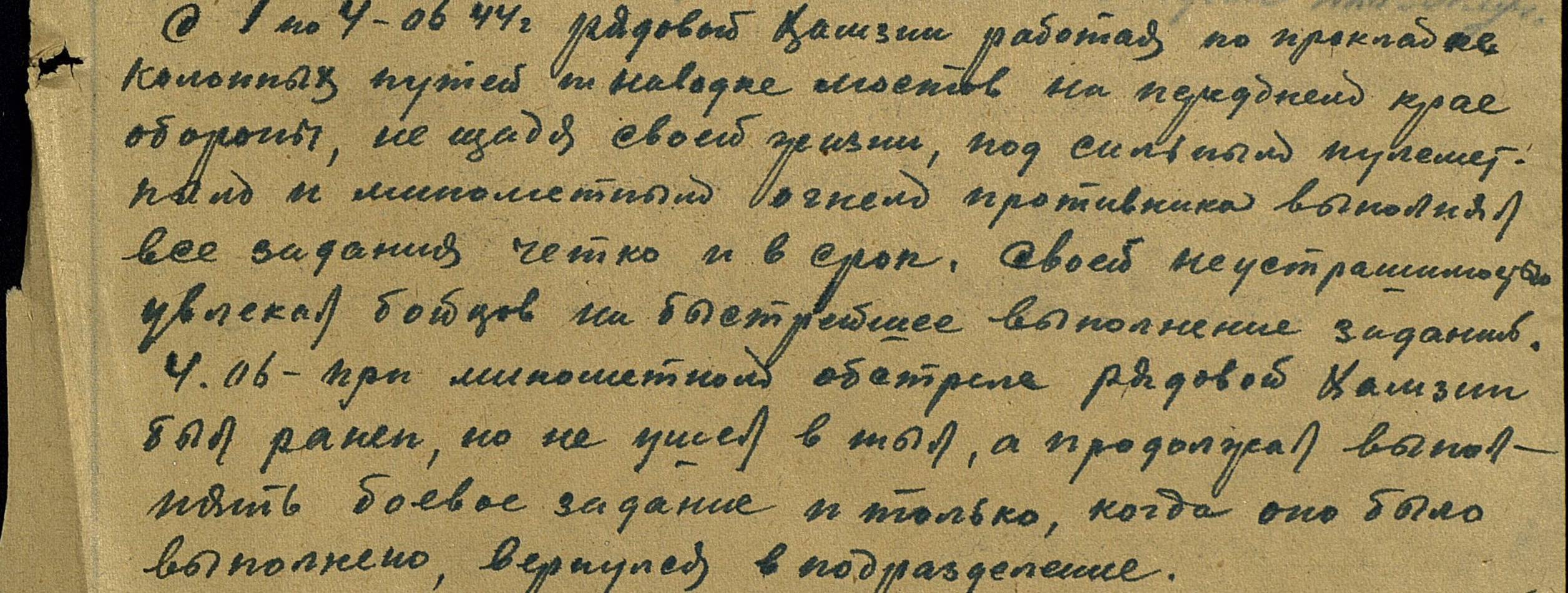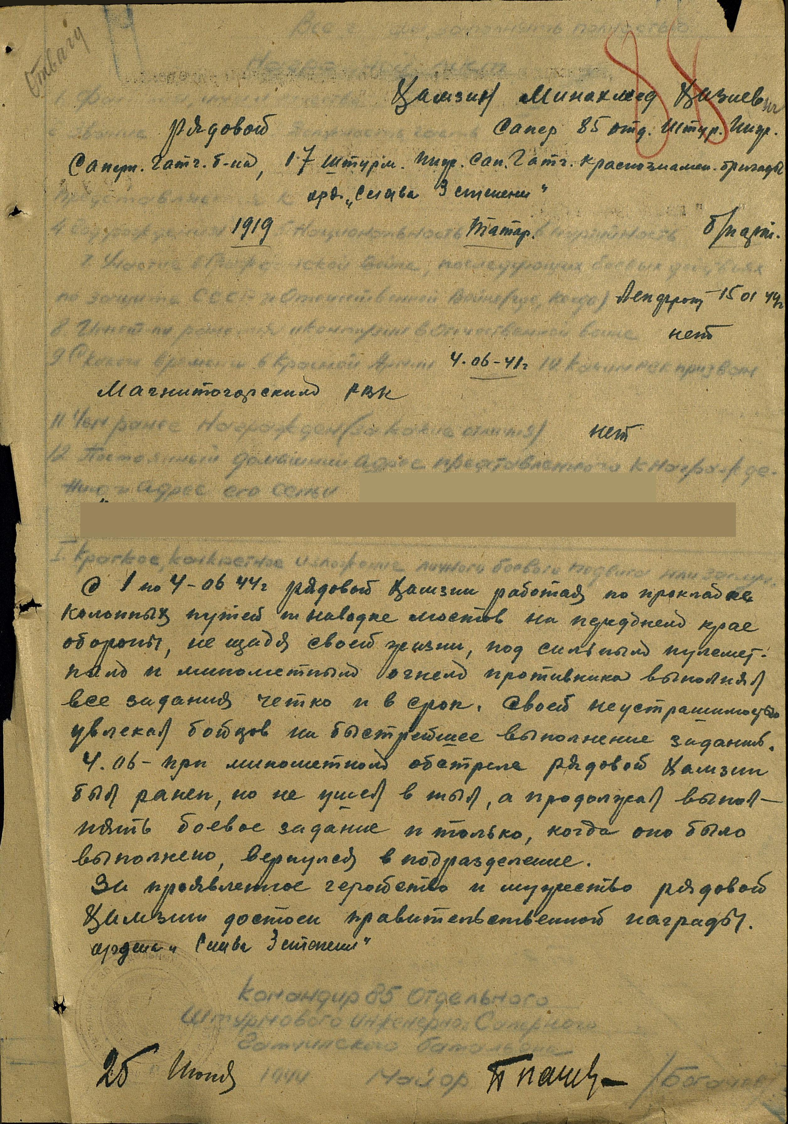 Хамзин Минахмет Хазиевич дата рождения 23.02.1919г родился в Татарстане, умер 10.06.1995г. в г. Магнитогорск.Призван РККА с 4.06.1941г. Управление 587 отдельного строительного батальона.Послужной список1)Упр.223 инженерный батальон в июне 1941г. Сапер2)Упр.223 инженерный батальон в марте 1942г. Химик3)Упр.223 инженерный батальон в апреле 1942г. Повар4)Эвако-госпиталь №12288 в июне 1944г.5) Упр.85 инженерно-саперный батальон в июле 1944г. Повар6)Эвако-госпиталь №12288 в июле 1944г.7) Упр. 85 инженерно-саперный батальон в Сентябре 1944г. Повар8)Военный склад №1928 в ноябре 1945г.Повар9) Согласно Указа призидиума Верх.совета СССР от 20.03.1946г.; 6.05.1946г.- демобилизован.Верх. Главнокоманд.марш.СССР товарищ Сталин объявил благодарность за отличное боевое действие в боях при прорыве сильной,глубоко заминир. обороны на берегу реки Вислы.Приказ №221 от 16.01.1945г.Благодарность за отличное боевое действие по овладению городами Голнов, Штепенитц, Массов, всему личному составу соединения принимавшей участие в боях. Приказ №295 от 7.03.1945г.Благодарность за отличное боевое действие в боях при вторжение Германии. Приказ №265 от 29.01.1945г.Благодарность за отличное боевое действие в боях при овладении города Штаргард, всему личному составу соединения приниавшей участия в боях. Приказ №290 от 5.03.1945гНаграда Орден Славы 3 степени.Медаль "За отвагу"