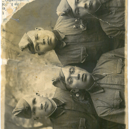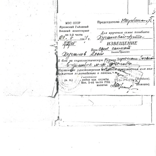 Боевой путь ветерана Хусаинов Алый.  1920 года рождения (точная дата рождения неизвестна). Уроженец д.Карбаны Ярковского района Тюменской области. Призван в ряды Красной Армии в 1940 году Ярковским комиссариатом, Тюменской области.  Был женат на Хусаиновой Хасане. Родилась дочь - Хусаинова Ачиля Алыевна (Нигматуллина А.А замужество). Имел значок ГТО 1 степени. В 1947 году матери красноармейца пришло извещение о том, что в декабре 1941 года он пропал без вести. На фотографии кроме него еще три красноармейца. Надеемся, кто то узнает своих родственников или что то известно о моем дедушке, Хусаинове Алые.