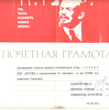 Таким образом завершился славный боевый путь 61-й армии, в составе которой воевал мой отец, Ягичев Умер Шукурович.После окончания военных действий 61-я армия вошла в сос тав Центральной группы войск, затем передислоцирована вг. Ростов-на-Дону, в августе 1945 была расформирована... А старший лейтенант Ягичев по решению командования остался служить в Германии еще на два года...... но об этом периоде я уже ничего не знаю, а очень хотелось бы найти информацию об этом, так же, как и о его боевых наградах, просто боюсь ошибиться, но на фото они при нем, они потерялись, в силу *некоторых обстоятельств... а в архиве ЦАМО смогла найти только одно подтверждение: орден Красной Звезды.А уверена, что орденов у него было, по меньшей мере-два.