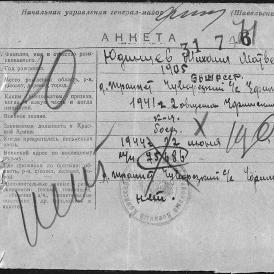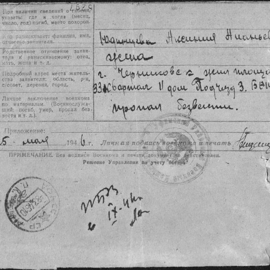 адресу п/п 75686 было получено в июне 1944 года. После его жена Юдинцева