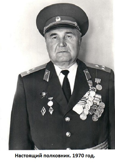 В 1955 году получил чин полковника. За годы службы выполнял различные поручения командования, в том числе в разрешении Карибского кризиса 1962 года, за что получил благодарность и ценный подарок лично от лидера Кубинской революции Фиделя Кастро. В 1970 году я вышел в отставку, прослужив в Советской Армии 31 год. Награжден орденом Красной Звезды и орденом Отечественной войны 2 степени, а также 10 медалями - «За боевые заслуги», «За оборону Москвы», «За победу над Германией» и другими памятными медалями».