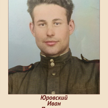 ЮРОВСКИЙ ИВАН ПАВЛОВИЧ По национальности - русский, родился в 1922 году в селе Ново-Покровка Северо-Казахстанской области, Казахская ССР. Окончил 10 классов школы, был членом ВЛКСМ. 22.02.1941 г. призван в ряды Красной Армии. Место призыва: Октябрьский РВК, Казахская ССР, Северо-Казахстанская обл., Октябрьский р-н. Воинское звание и должность: красноармеец, ефрейтор, мл. сержант; стрелок, шофер. После войны- капитан юстиции. Участие в боевых действиях, боевых походах: 1941- 1943гг.- Воронежский фронт; 1943- 1945 гг.- 1-й Украинский фронт; 2 Отдельный Дорожно-Эксплуатационный ордена Красной Звезды батальон Танковой Армии ( в/ч 44 зсп ; 44 зп; 206 сд 40 А ВорФ; Упр. ВАД 15; 12 гв. ТА 1 УкрФ ; 2 одэб 1 гв. ТА). Был тяжело ранен. Награды : Орден "Красная Звезда" Медаль «За отвагу» Медаль «За боевые заслуги» Медаль «За взятие Берлина» Медаль «За победу над Германией в Великой Отечественной войне 1941-1945 гг.» Медаль «За оборону Москвы» Медаль «За освобождение Варшавы» Медаль «За взятие Вены» Медаль "50 лет Вооруженных сил" Знак «Отличный шофер». За отличную службу в Красной Армии командованием части был награжден велосипедом, гармонью и фотоаппаратом. Демобилизован 22.10.1946г. С 1947 г. по 1949 г. прошел курс обучения в Харьковской юридической школе Министерства Юстиции УССР, присвоена квалификация- юрист. В 1953 г. окончил экстерном полный курс юридического факультета Вильнюсского Государственного университета. Работал следователем прокуратуры, юрисконсультом, был очень грамотным, эрудированным и уважаемым человеком. Член КПСС. Семейное положение: жена- Юровская Лилия Моисеевна (1921-1990гг, дев. фамилия Сендерова, из г. Кременчуг Полтавской обл.), двое сыновей- Юрий и Михаил, трое внуков. Похоронен в октябре 1979 г. на Украине, в г. Мерефа Харьковской области, рядом с женой и старшим сыном.