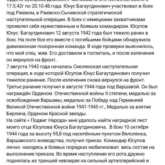 Юсупов Юнус Багаутдинович родился 20 июля 1923 года в селе Артемьевка Абдулинского района Чкаловской области ( сейчас Оренбургская область).В Красной Армии прадед был 1941 года. Окончил Вольское военное училище и был направлен на фронт младшим лейтенантом. Он был командиром стрелковой 8 роты 1281 Стрелкового полка 60 Стрелковой Севской Краснознамённой Ордена Суворова дивизии.Участвовал в Отечественной войне с 17.5.42г по 20.10.48.года. Юнус Багаутдинович участвовал в боях под Ржевом, в Ржевско-Сычевской стратегической наступательной операции. В боях с немецкими захватчиками проявлял себя мужественным и боевым командиром. Юсупов Юнус Багаутдинович 12 августа 1942 года был тяжело ранен в бою. На поле боя его вместе с погибшими бойцами обнаружила дивизионная похоронная команда. В ходе проверки выяснилось, что мой отец жив. Его доставили в госпиталь, и после излечения он вернулся на фронт. 7 августа 1943 года началась Смоленская наступательная операция, в ходе которой Юсупов Юнус Багаутдинович получил тяжелое ранение. После излечения снова вернулся на фронт. Третье ранение получил в августе 1944 года под Варшавой. Он был награждён Орденом Отечественной войны II степени, медалью за освобождение Варшавы, медалью за Победу над Германией Великой Отечественной войне 1941-1945 гг., Медалью за взятие Берлина, Орденом Красной звезды. На сайте « Подвиг Народа» мне удалось найти наградной лист моего отца Юсупова Юнуса Багаутдиновича. В бою 10 октября 1944 года за высоту 95,8 под населённым пунктом Вялоленка, Варшавского воеводства, получил приказ. Командир Юсупов лично находясь в боевых порядках мобилизовал весь состав на выполнение приказа. Во время наступления его рота дружно поднялась из траншей невзирая на сильный артиллерийский и минометный огонь противника. Маневрируя на поле боя его рота ворвалась на рубеж противника и закрепилась там. Товарищ Юсупов Ю.Б. достоин Правительственной награды ордена «Красная звезда». Домой вернулся 1948 году старшим лейтенантом. Воспитал шестерых детей.