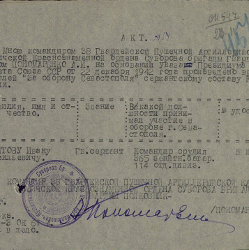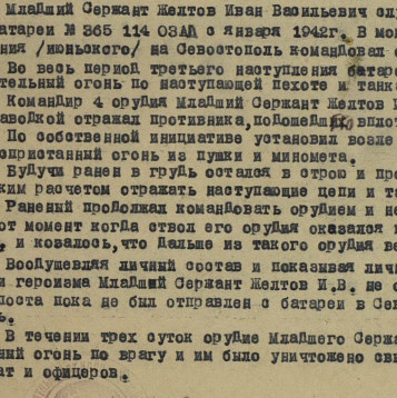22 июня 1942 г. под Севастополем он получил осколочное ранение в грудь, но остался в строю и трое суток продолжал вести губительный огонь по врагу из пушки и миномёта и командовать орудием.