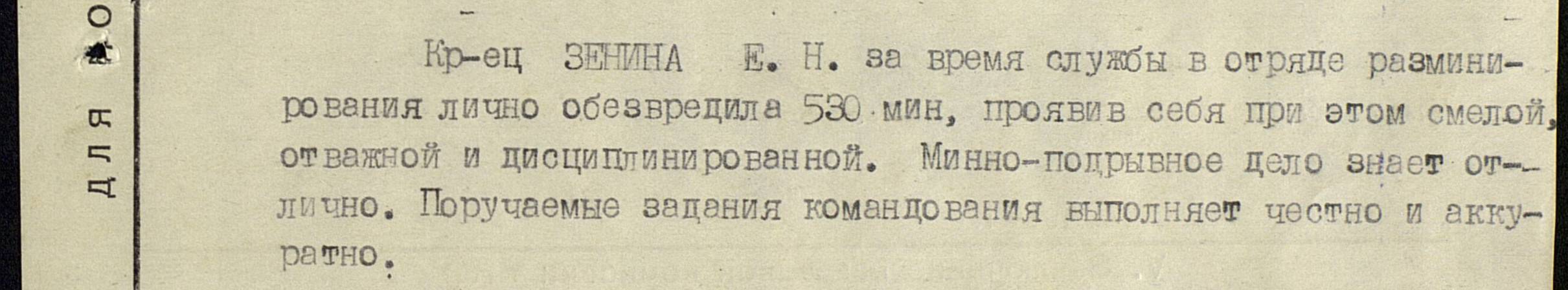 Призвана на Фронт 20 августа 1943 года, минёром в 206 отдельный отряд разминирования. Второго Украинского Фронта и служила до 14 сентября 1945 года. Участвовала в боевом пути части - Корсунь - Шевченской операции и закончила войну участвовав в Пражской стратегической операции, после войны была занята разминированием Советской земли. После войны и вернулась домой город Семилуки Воронежской области в 1946 году.Награждена: медалью "За отвагу", орденом