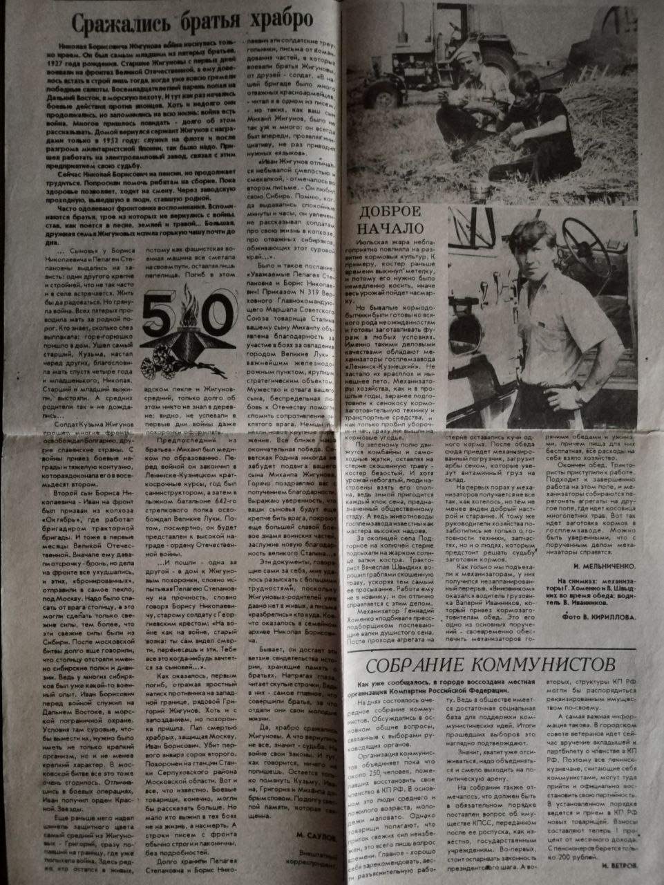 Жигунов Николай Борисович, родился 30 мая 1927 года в посёлке Баикаим Ленинск-Кузнецкого района в рабочей семье. Призван на службу в Ленинск-Кузнецкий РВК, Кемеровская обл., Ленинск-Кузнецкий р-н 20 сентября 1944 года в 78 бмп Имел звание Сержант, связист. С этим званием и вернулся с войны. 22 октября 1951 завершил службу в рядах Вооружённых сил СССР. После войны работал на Электроламповом заводе в Ленинске-Кузнецком. Награждён медалью "За победу над Японией", а в 1985 году орденом Отечественной войны 2 степени. Скончался Николай Борисович 26 марта 2002 года.