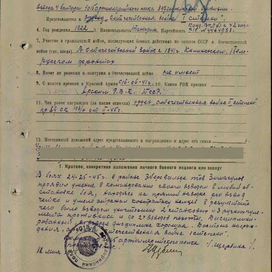 Призвался в конце мая 1941 года, из Арского педагогическо-го училища, где он учился вместе со своей женой Сажидой. Прошел всю войну до Берлина в составе Калининского, за-тем 1-го Белорусского фронтов Командиром огневого взвода ар-тиллерийского полка. Кавалер орденов Отечественной войны 1 и 2 степени. Награжден медалями «За освобождение Варшавы» и «За взятие Берлина». После войны 2 года участвовал в восстановлении города Берлин. Вернувшись в д. Новая-Юльба Атнинского района Татарской АССР работал учителем, а затем и директором начальной шко-лы. Про Великую Отечественную войну рассказывал очень ма-ло, оберегая своих детей и внуков от ужасов войны. В нашей семье хранятся ордена и медали, военный бинокль и лупа.
