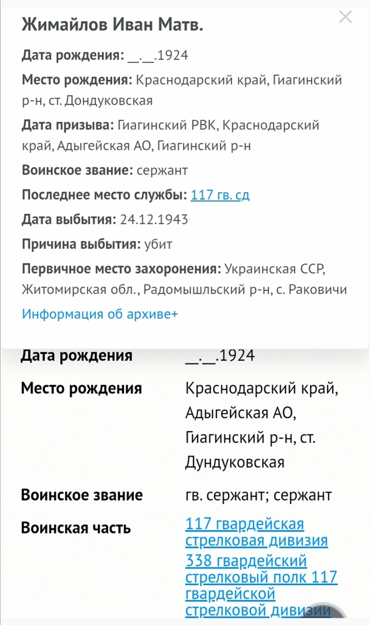 Погиб в бою 24.12.1943г., сражаясь в составе 338 гв. сд. 117 гв. полка в звании гв. сержант (п/п 42637) - ком. отр.