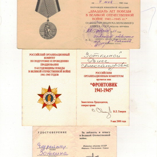 Зоткина (Лепнухова) Раиса Александровна родилась 15 марта 1923г .До войны с 1938 года ,после смерти отца работала дояркой .В 1942 году 18 летней девушкой ,ушла добровольцем на фронт ,принимала участие в Сталинградской битве от начала и до полного разгрома фашистов ,боевой путь проходит в 3-м Белорусском фронте под командованием генерала Толбухина .С начала рядовой ,потом в звании Ефрейтора ,все время была зенитчецей-командиром орудийного расчета .Дошла до города Дрогобыч,там и встретила победу.Вернулась домой в Августе 1945 года.Всю жизнь проработала дояркой в совхозе Пролетарий Иловлинского района.Общий трудовой стаж 37 лет ,много лет была передовой дояркой -за что получала ценные подарки и вознаграждения