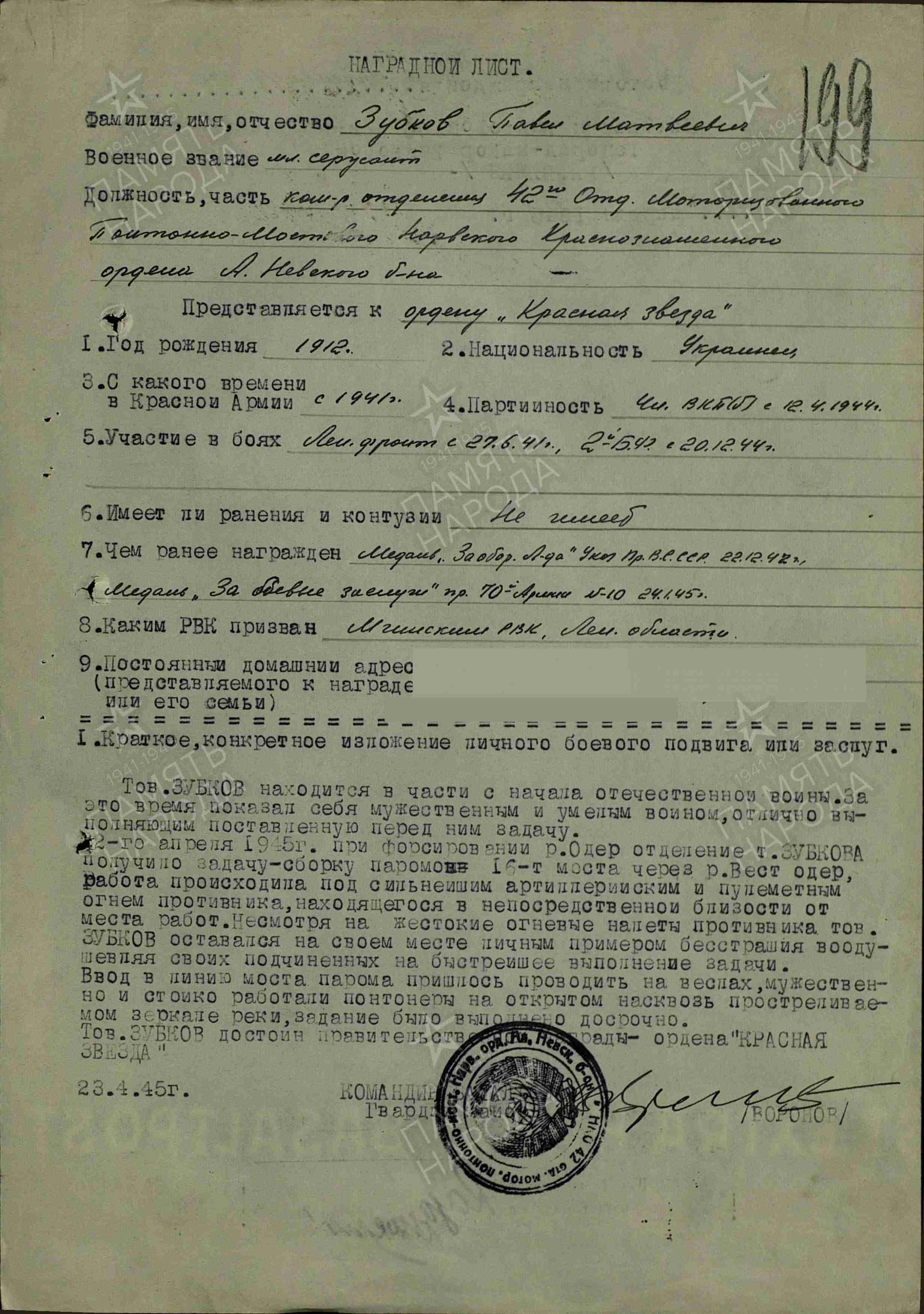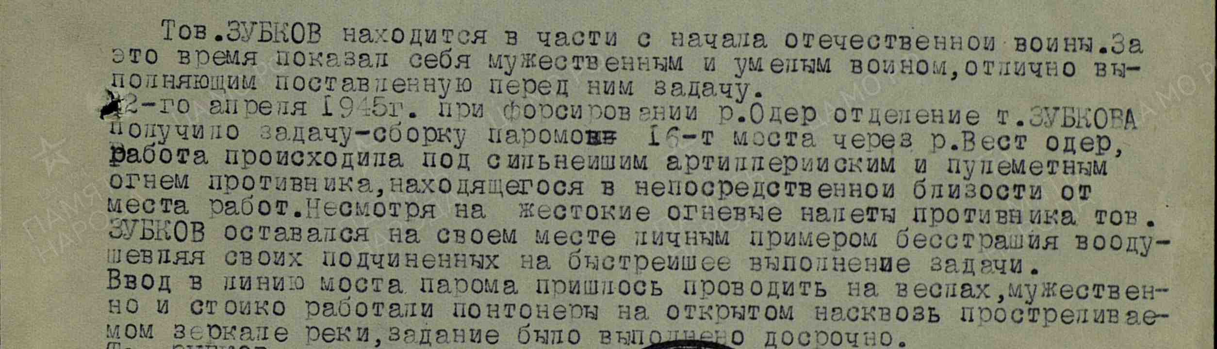 «... с первого-же дня наступления с 14.1.45г. т. ЗУБКОВ выполнял задание по обепечению маршрута продвижения частеи 96 С.К. Противник перекрыл дорогу многочисленными минными полями фугасами, заминировал мосты. .Все это прикрывалось многослоиным огнем пулеметов и минометов в этих тяжелых условиях т. ЗУБКОВ сумел личным примером бесстрашия и мужества вдохновить личный Ввод в линию моста парома пришлось проводить на веслах мужественно и стойко работали понтонеры на открытом насквозь простреливаемом зеркале реки, задание было выполнено досрочно. ...»