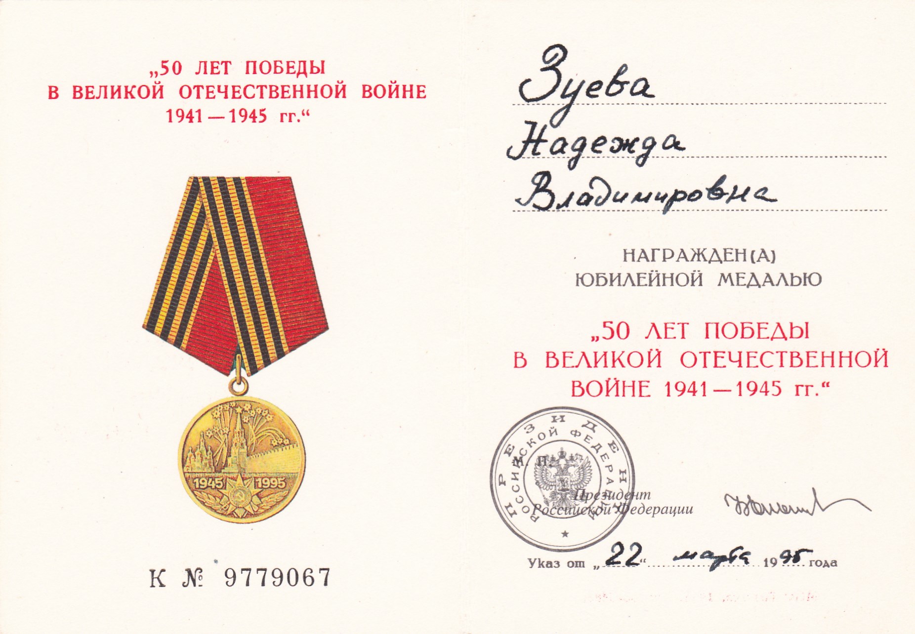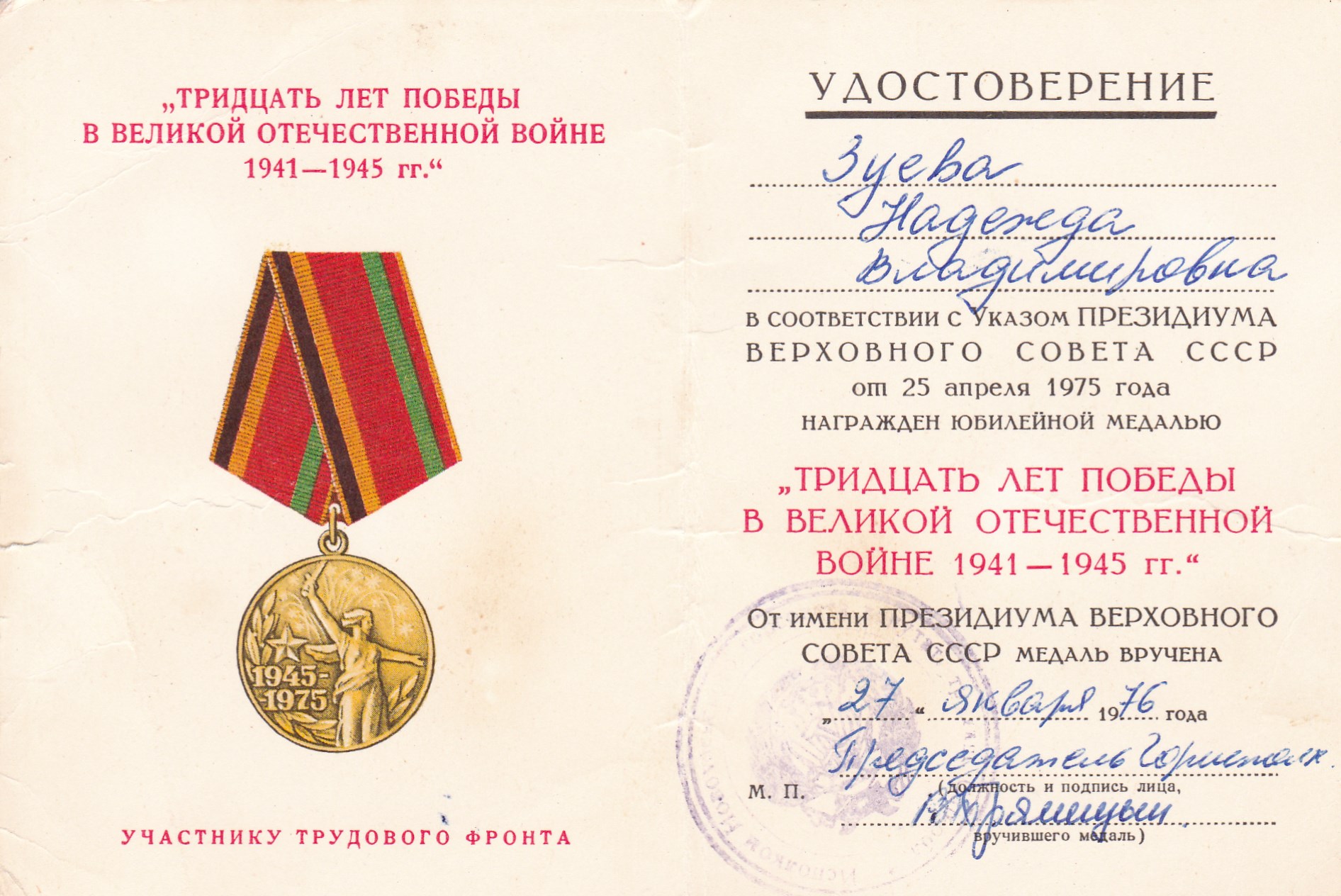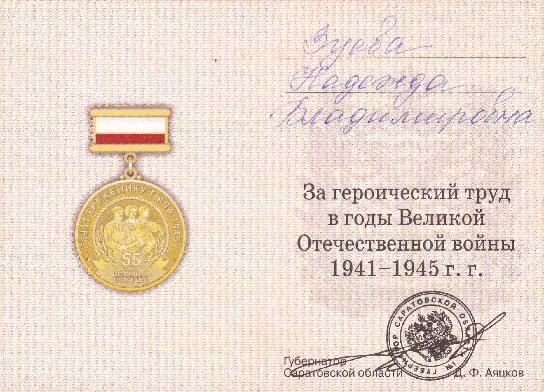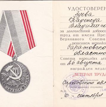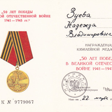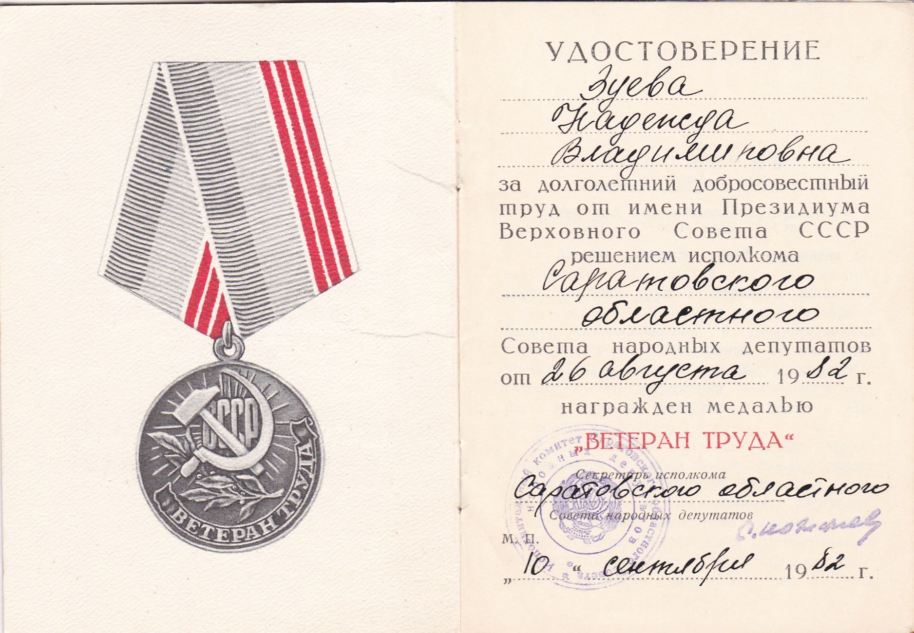 Была на окопах при обороне Москвы и на заводе-шлифовщицей при изготовлении снарядов.В мирное время работала почтальоном.