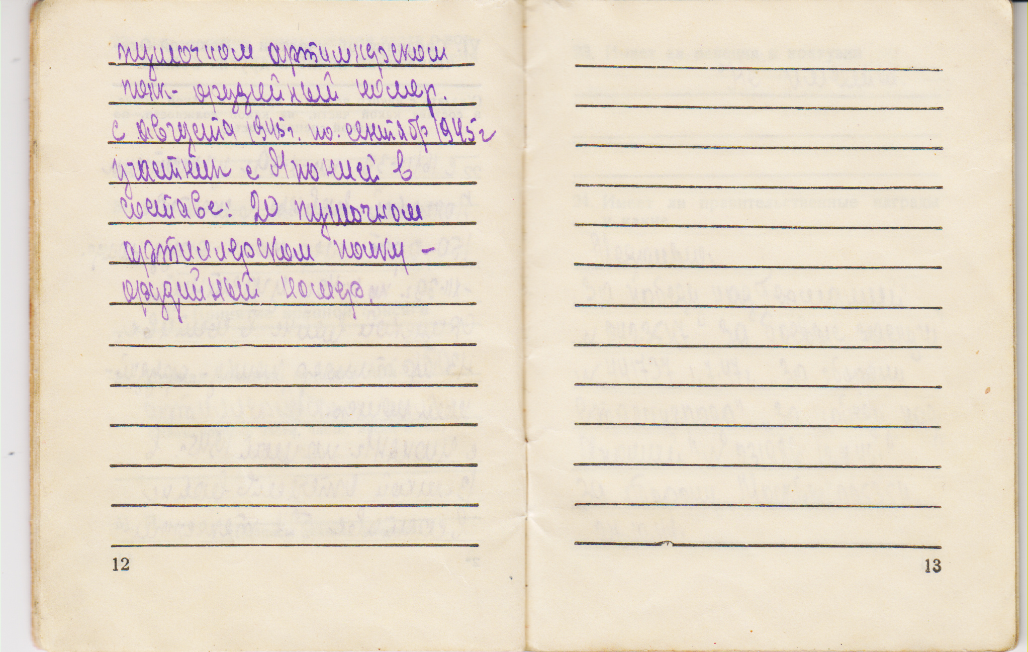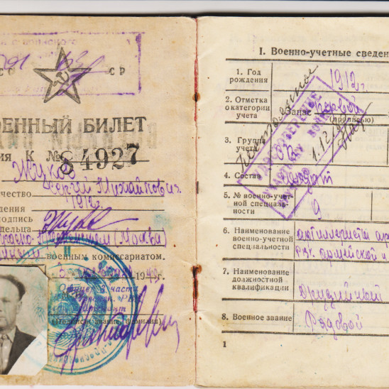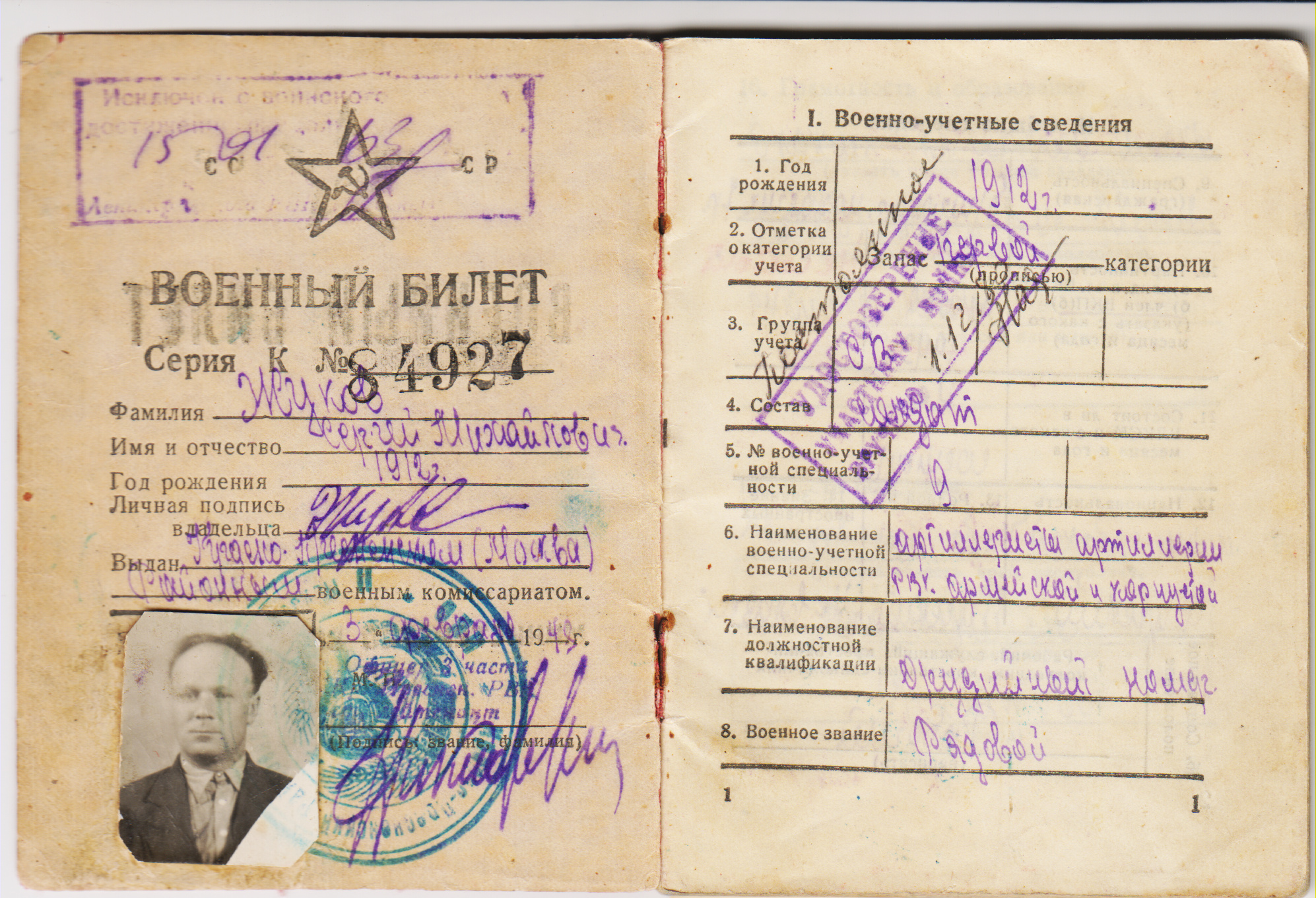 Жуков Сергей Михайлович, 1912 года рождения. Родился в деревне Филатово, Рязанской области, Кораблинского района. В семье крестьянина Жукова Михаила Федоровича – середняка. 1932г. призвали в ряды РККА. Направили в108 артиллерийский полк в Коломне. 1934г. окончил службу рядовым. Образование имел -- 4 класса сельской школы. Уехал в Москву на з-д “Пролетарский Труд” имени Корзинина. С 1934 по 1939 год работал гвоздильщиком. 1 сентября 1939 года по частичной демобилизации призван в армию, в 150 артиллерийский полк города Москвы. 2 сентября 1939 года полк был послан освобождать Зап. Белоруссии (осв. Синшан ?) (Поводом послужило сообщение – будто бы парикмахер зарезал бритвой офицера!!!). После освобождения Западной Белоруссии полк перебросили на Ленинградский фронт на войну с финами. (декабрь – январь -- апрель -- март). Участвовал в боях с финами в составе 43 ТКАП ( тяжелый корпусной краснознаменный артиллерийский полк) -- линия Маннергейма, Карельский перешеек, город Выборг. Под Выборгом были сильные бои. Воевал на 203мм дальнобойном орудии - замковым: затвор открывает, снаряд, закрытие затвора, запальная трубка, боек заводит на пристрел, докладывает: “Орудие к бою готово!” Наводчик: “ К бою готово!”. До 16 марта 6 часов вечера. Потом стояли под Выборгом. 16 мая 1940 года перебросили в Эстонию – «подавали Братскую руку...». В июле 1940 года демобилизовался. На заводе “Пролетарский Труд” работал гвоздильщиком по июнь 1941г. Был призван в июне 1941 года Красно-Пресненским РВК города Москвы, в ряды Красной Армии. В составе 524-го тяжелого пушечного артиллерийского полка принял участие в обороне Москвы, с 1 декабря 1941 по 25 января 1942 года. В звании рядового, орудийного номера 203-мм гаубицы (заряжающим). Из его рассказов помню, что было им очень тяжело. Орудие перемещалось с помощью восьми лошадей, в слякотную погоду, сдвинуть его было практически невозможно. Немцы знали об этом и часто атаковали их самолетами. Жить приходилось не всегда в домах, чаще это были землянки со всеми вытекающими неудобствами, в том число приходилось бороться со вшами. Весь путь в Великой Отечественной Войне, с первого дня до последнего, у деда был пройден под командованием подполковника Терехина Михаила Алексеевича, 1910 года рождения. Комиссар полка – майор Долгов. Командир батареи – старший лейтенант Бессарабов (до 1943 года), с 1943 года – старший лейтенант Касаткин. Командир взвода – лейтенант Воловик (примечание: возможно Воловой?). Закончил войну в сентябре 1945 года на Японском фронте.