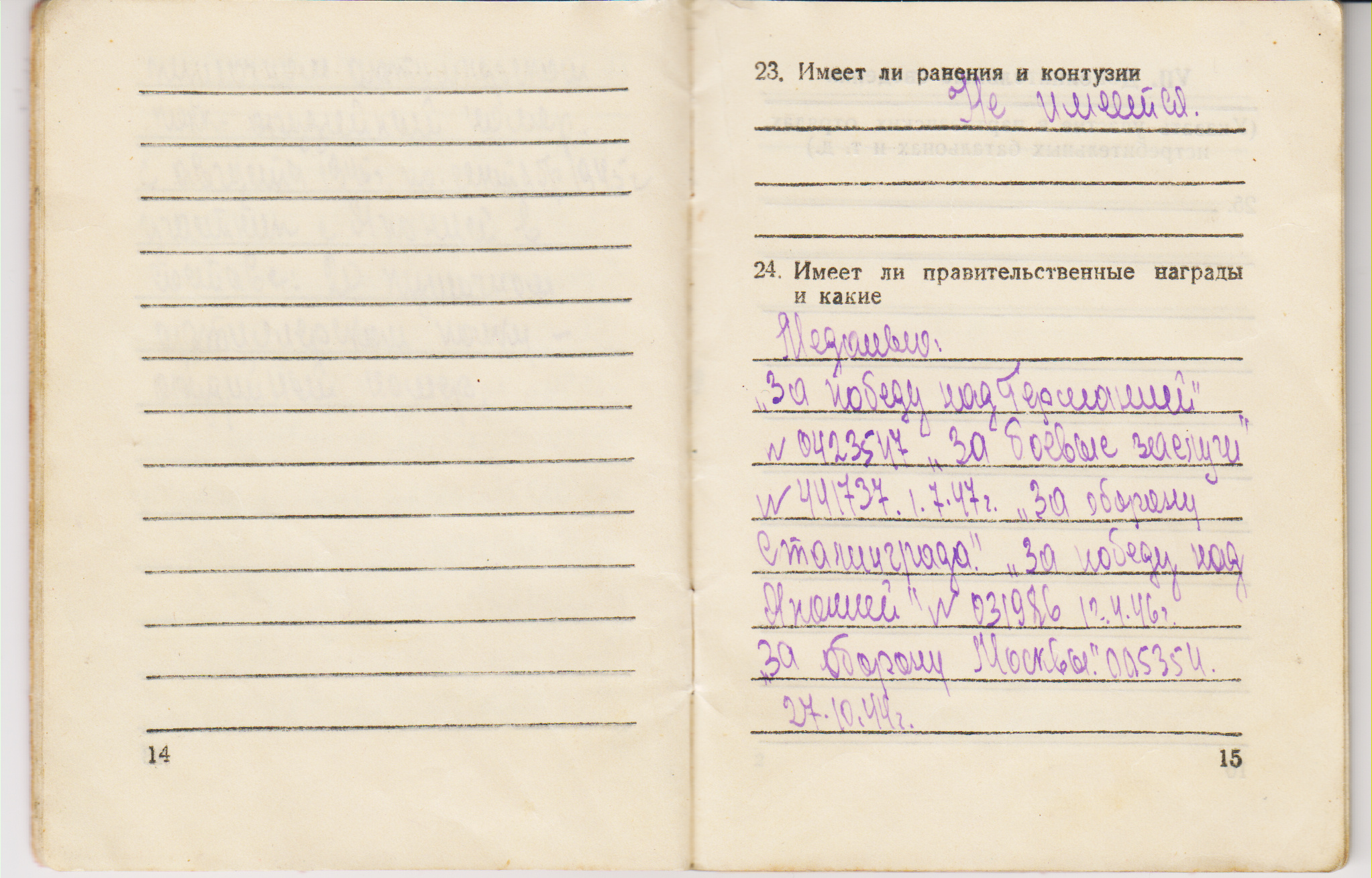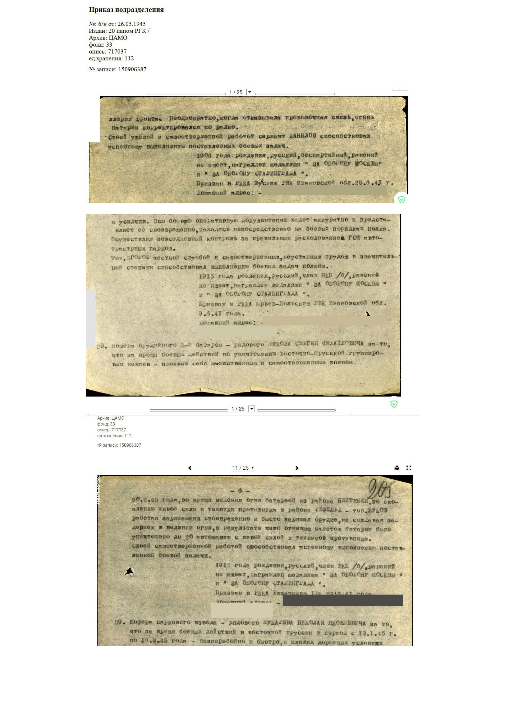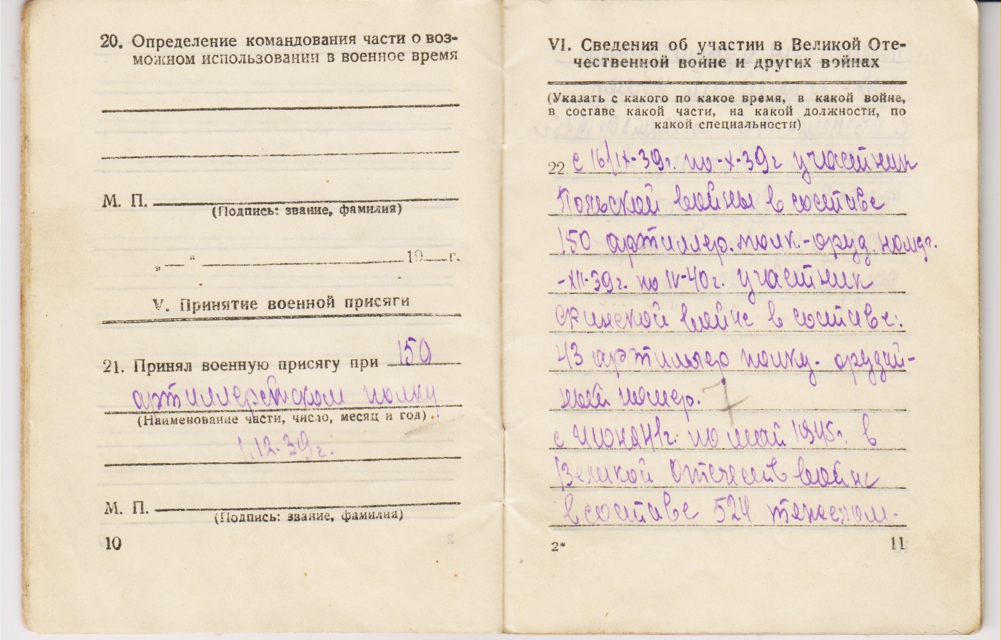 Жуков Сергей Михайлович, 1912 года рождения. Родился в деревне Филатово, Рязанской области, Кораблинского района. В семье крестьянина Жукова Михаила Федоровича – середняка. 1932г. призвали в ряды РККА. Направили в108 артиллерийский полк в Коломне. 1934г. окончил службу рядовым. Образование имел -- 4 класса сельской школы. Уехал в Москву на з-д “Пролетарский Труд” имени Корзинина. С 1934 по 1939 год работал гвоздильщиком. 1 сентября 1939 года по частичной демобилизации призван в армию, в 150 артиллерийский полк города Москвы. 2 сентября 1939 года полк был послан освобождать Зап. Белоруссии (осв. Синшан ?) (Поводом послужило сообщение – будто бы парикмахер зарезал бритвой офицера!!!). После освобождения Западной Белоруссии полк перебросили на Ленинградский фронт на войну с финами. (декабрь – январь -- апрель -- март). Участвовал в боях с финами в составе 43 ТКАП ( тяжелый корпусной краснознаменный артиллерийский полк) -- линия Маннергейма, Карельский перешеек, город Выборг. Под Выборгом были сильные бои. Воевал на 203мм дальнобойном орудии - замковым: затвор открывает, снаряд, закрытие затвора, запальная трубка, боек заводит на пристрел, докладывает: “Орудие к бою готово!” Наводчик: “ К бою готово!”. До 16 марта 6 часов вечера. Потом стояли под Выборгом. 16 мая 1940 года перебросили в Эстонию – «подавали Братскую руку...». В июле 1940 года демобилизовался. На заводе “Пролетарский Труд” работал гвоздильщиком по июнь 1941г. Был призван в июне 1941 года Красно-Пресненским РВК города Москвы, в ряды Красной Армии. В составе 524-го тяжелого пушечного артиллерийского полка принял участие в обороне Москвы, с 1 декабря 1941 по 25 января 1942 года. В звании рядового, орудийного номера 203-мм гаубицы (заряжающим). Из его рассказов помню, что было им очень тяжело. Орудие перемещалось с помощью восьми лошадей, в слякотную погоду, сдвинуть его было практически невозможно. Немцы знали об этом и часто атаковали их самолетами. Жить приходилось не всегда в домах, чаще это были землянки со всеми вытекающими неудобствами, в том число приходилось бороться со вшами. Весь путь в Великой Отечественной Войне, с первого дня до последнего, у деда был пройден под командованием подполковника Терехина Михаила Алексеевича, 1910 года рождения. Комиссар полка – майор Долгов. Командир батареи – старший лейтенант Бессарабов (до 1943 года), с 1943 года – старший лейтенант Касаткин. Командир взвода – лейтенант Воловик (примечание: возможно Воловой?). Закончил войну в сентябре 1945 года на Японском фронте.