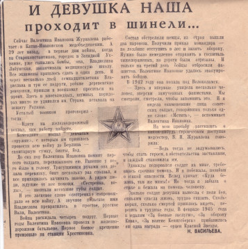 В составе бригады она воевала сначала на 3 –Белорусском фронте, позже на 2-Белорусском фронте. Прошла с боями Литву, Польшу, Германию. Там познакомилась со своим будущим мужем- Журавлевым Борисом Семеновичем. Валентина Ивановна прошла боевой путь от Староканстонтинова почти до Берлина г. Темплин награждена боевыми наградами «За боевые заслуги», «Орденом Красной звезды». В представлении к награждению медалью «За боевые заслуги» отмечается , что она как опытная и преданная своему делу медицинская сестра, отдает все свои усилия и опыт делу восстановления здоровья раненых и больных бойцов и офицеров. Чрез ее руки прошли до 3000 раненых и больных, которые все получили должную помощь и уход. Помимо своей основной работы, ей приходилось дополнительно еще работать в перевязочной, где она непосредственно оказывала помощь раненым. Орденом «Красной Звезды» она была награждена за самопожертвенность, энергию и инициативу проявленную при спасении жизни командира бригады полковника Немировского.