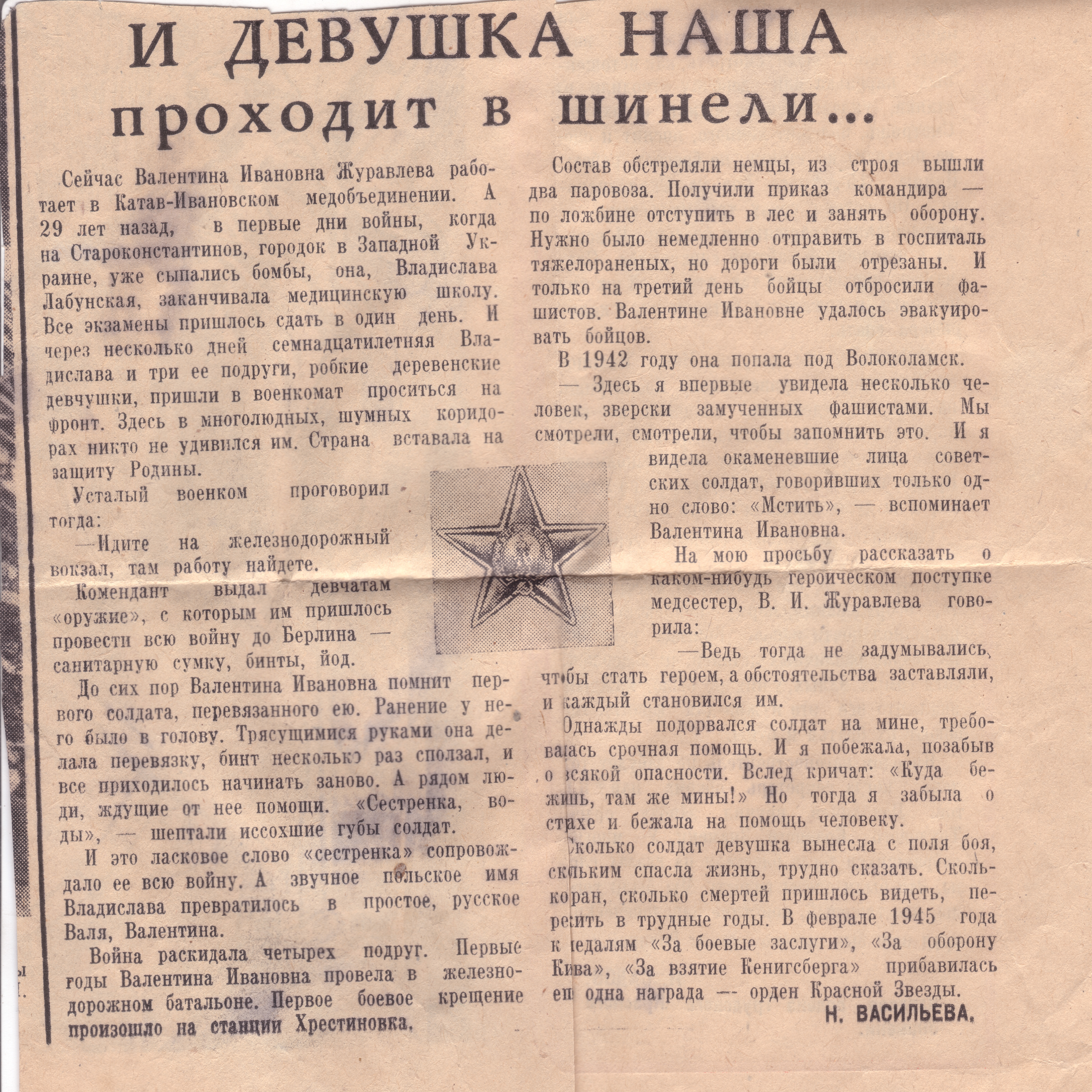 Журавлёва Валентина Ивановна (Лабунская Владислава Ивановна) родилась 21 декабря 1922 года на Украине в Каменец-Подольской обл. (сейчас Хмельницкая область) Староконстантиновского р-на, село Малый Чернятин. В семье крестьянина-середняка. По национальности полька В 1930 году поступила учиться в Мало - Чернятинскую начальную школу. После окончания четырехлетки училась в селе Большом Чернятине в средней школе. В 1938 был репрессирован ее отец – Лабунский Иван Павлович (реабилитирован в 1956 году постановлением Верховного суда УССР). В 1939 году после окончания 8 классов школы. поступила в г. Старо-Константиновский 2-х годичный техникум медицинских сестер.