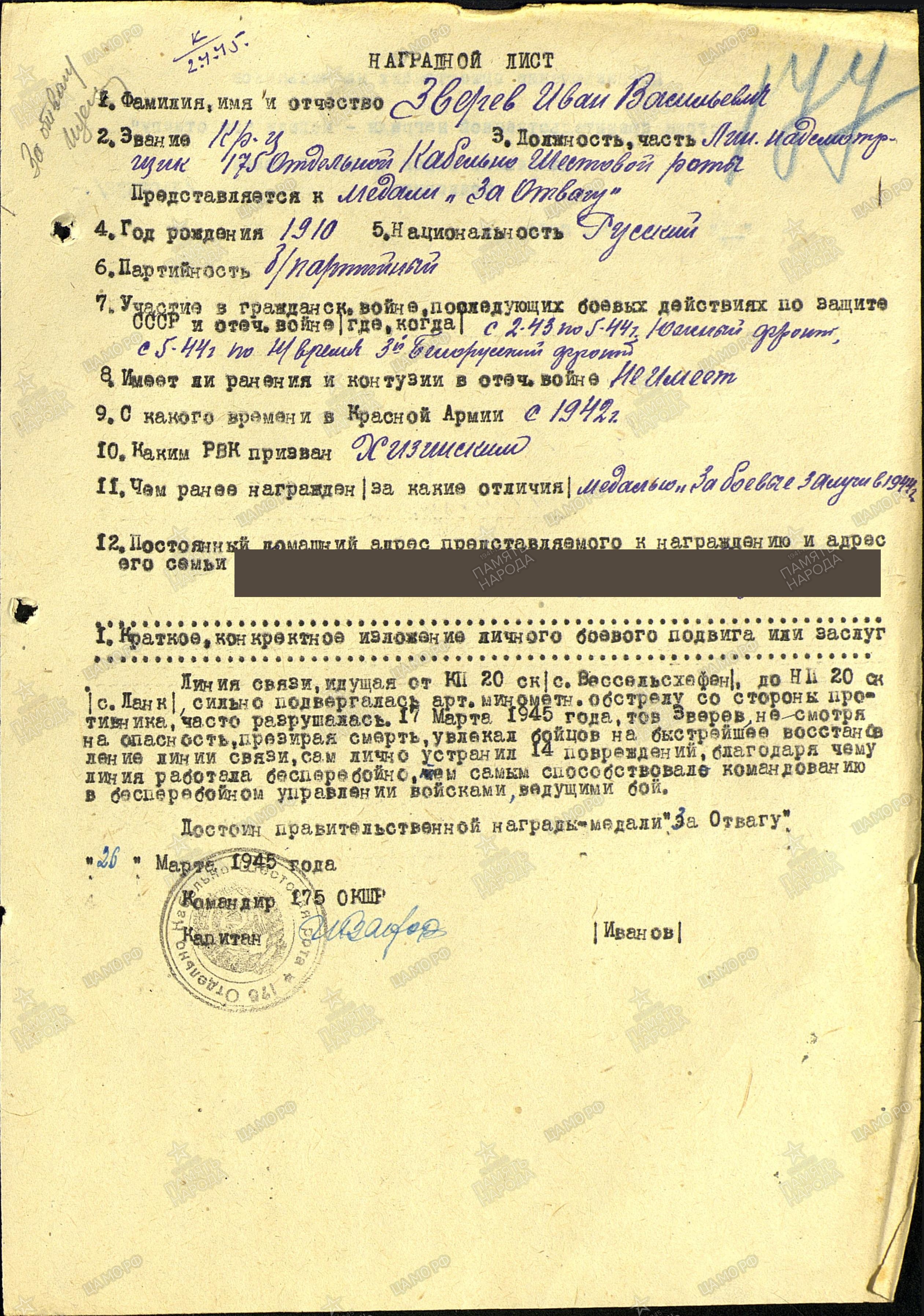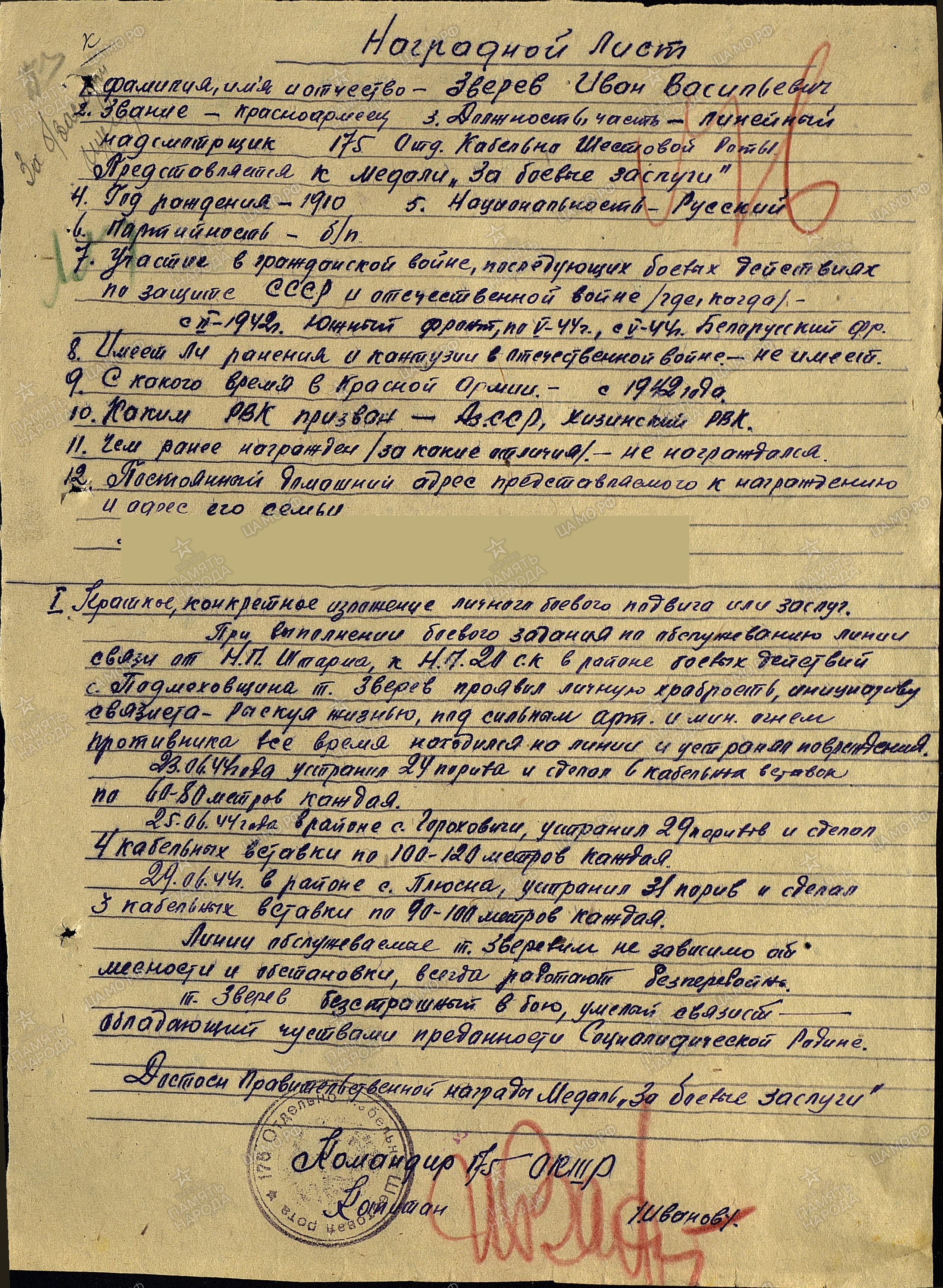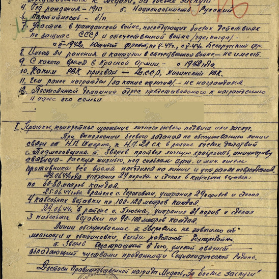 ,Белорусский фронт ,связист 175й отдельной кабельно шестовой роты ,награждён