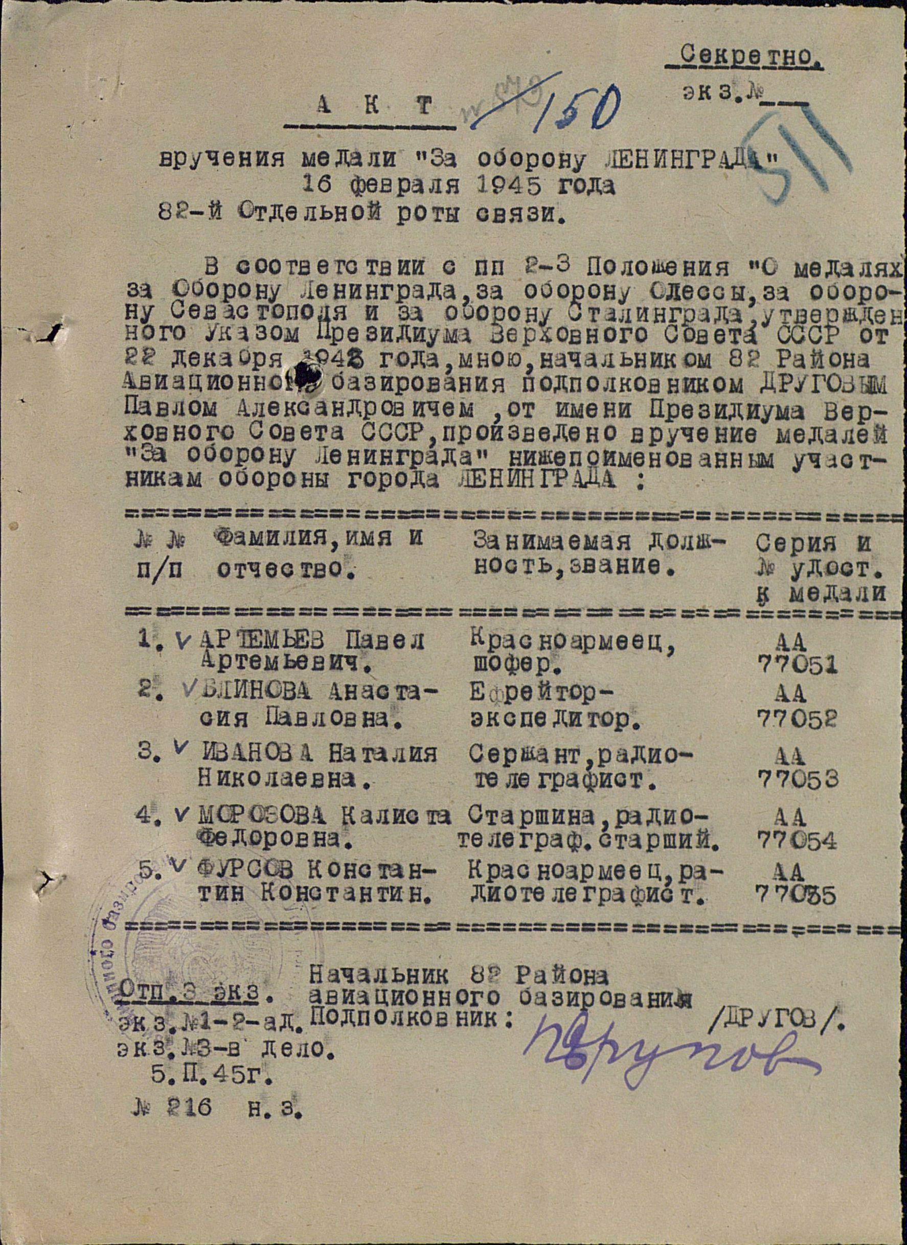 Должность, часть: с 18.05.1942 радиотелеграфист, затем старший радиотелеграфист радиостанции 82-й Отдельной Роты Связи 82 Район Авиа Базирования