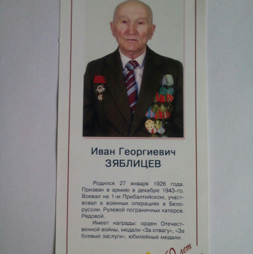 Родился 27.01.1926 года в деревни Лазари Уржумского района Кировской области. На фронт забрали в декабре 1943 года 17-летним юношей. Попал в Первый Прибалтийский флот под командованием генерала армии И.Х. Баграмяна. Прибалтика в планах немецкого руководства всегда занимала важное место. Она прикрывала Восточную Пруссию с северо-востока. Контроль над ней позволял германскому флоту действовать в восточной части Балтийского моря и поддерживать связь со Скандинавскими странами, которые поставляли Германии стратегические материалы. Прибалтика и сама являлось базой снабжения. К концу августа 1944 года общая обстановка в Прибалтике определялась результатами проведения проведенной Красной Армией Белорусской наступательной операции. Из Германии, а также с других участков фронта в Прибалтику было переброшено несколько пехотных и танковых дивизий, большое количество танков и штурмовых орудий. К участию в Прибалтийской операции привлекались и войска 1-го Прибалтийского флота. Иван Зяблицев принимал участие в операции «Багратион». Тогда, летом 1944-го, в ходе операции «Багратион» советские войска, пройдя за два месяца с боями несколько сот километров, нанесли поражение группе армий «Центр», освободив Белоруссию, часть Литвы и Польши. Иван Зяблицев был ранен в коленный сустав. А после выздоровления его определи в третий Сталинградский механизированный корпус под командованием генерала-лейтенанта В.Т. Обухова. После очередного ранения в плечевой сустав, которое случилось 8 марта 1945 года, солдата направили в 116 Рижский погранотряд, а оттуда – на Южный Сахалин, где назначили рулевым на корабле. - На фронте выстрелов не слышно, - рассказывает ветеран. – Там такой гул от рвущихся снарядов стоит, что единичных выстрелов и не слыхать. Первые снаряды «катюши» выпустит, затем остальная армия наступает. Я стрелял из стандартного пулемёта. Одно тело весит 24 килограмма, щит – 15, станок – 32, ещё и коробки с лентами. Когда наступаем окапываемся, окоп делаем «подковой». Если немцы не успевали отступить, то их захватывали в плен. Над пленными не издевались, относились гуманно. Ненависть к противнику у нас не было. Война – дело такое: или ты, или тебя. И мы, они исполняли приказ. Самые радостные воспоминания военного времени у Ивана Георгиевича, конечно, связаны с Победой. 9 мая 1945 года он лежал в госпитале, спустился в столовую на завтрак. А там все радостные, поздравляют друг друга с победой, плачут, смеются, обнимаются! В тылу победе радовались не меньше: фронт кормила деревня, а сама голодала, - рассказывает Александра Ивановна. – Военное время было очень тяжёлым, очень. Вспоминать трудно, сердце замирает. Когда начинается война, в воздухе веяло тревогой, одна за другой приходили повестки, на фронт уходили отцы и братья, летали похоронки. Но никто не роптал, люди стали сплоченнее, добрее, делились друг с другом всем. Каждый был готов отдать на фронт – и отдавал, только чтобы мы победили. Все ждали Победу. О Победе мы узнали в школе. Дети ликовали, кричали: «Папка придёт, брат придёт!». Не все вернулись с войны, приходили кто без руки, кто без ноги, многие возвращались инвалидами. Вот и Иван Георгиевич Зяблицев получил на войне три ранения. Старые раны дают о себе знать с годами. Тем не менее, Иван Георгиевич не любитель ездить по госпиталям за лечением. -Мы оба домашние, 