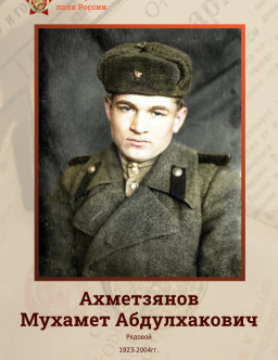 Ахметзянов Мухамет Абдулхакович Д.Большие Кармалы Камско- Устьинского района ТАССР 1923 - 2004 Ахметзянов Мухаметдин Ахметзянович Ахметзянов Мухаметхан Ахметзянович 1906 - 1987 Ахметзянов Нигматзян Ахметзянович 1905 - 1966 Ахметзянов Нигматулла Абдуллович 1914 - 1981 Ахметзянов Нигметзян Ахметзянович 1909 - 1974 Ахметзянов Раис Ахунович 1926 - 1973 Ахметзянов Рашид Газизович 1921 - 1942 Ахметзянов Рашит Тамурович 1921 - 2002 Ахметзянов Сабир Ахметзянович 1915 - 2005 Ахметзянов Сабирзян Ахметзянович 1910 - 1941 Ахметзянов Сабирзян Мухаметзянович Ахметзянов Сагит Сагирович Куйбышевская обл., Камышлинский р-н, с. Старое Ермакове 1915 - 2001 Ахметзянов Саидхан Нигмятзянович 1911 - 1973 Ахметзянов Салим Ахметзянович Башкортостан 1912 - 1944 Ахметзянов Султангали Ахунович село Кенгер-Менеуз 1921 - 2003 Ахметзянов Фагман Ахметзянович 1916 Ахметзянов Хаким Газизович 1917 - 2003 Ахметзянов Халяф Гаязович Башкортостан 1926 Ахметзянов Хантимир Давлетович 1927 - 2019