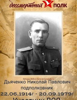 Дьяченко Николай Дмитриевич 1918 - 2014 Дьяченко Николай Никитович 1925 - 2005 Дьяченко Николай Павлович Дьяченко Николай Петрович Башкирская АССР, Благоварский р-н, с. Иваненково 1924 - 1991 Дьяченко Николай Сергеевич город Ворошилов 1918 - 1992 Дьяченко Николай Флорианович 1922 - 1970 Дьяченко Никон Иванович 1904 - 1943 Дьяченко Ольга Андреевна Дьяченко Ольга Андреевна Ростовская область, с.Кашары 1921 Дьяченко Ольга Николаевна 1918 - 2007 Дьяченко Павел Прокофьевич 1922 - 1988 Дьяченко Павел Свиридович с.Боровицы, Чигиринский район, Украинская ССР 1919 - 2012 Дьяченко Павел Стефанович 1921 - 1984 Дьяченко Петр Павлович 1926 - 1942 Дьяченко Петр Федорович 1896 - 1989 Дьяченко Семен Григорьевич Казахская ССР Акмолинская обл. Есильский р-он с. Бузулук 1911 - 1952 Дьяченко Семен Игнатьевич 1907 - 2000 Дьяченко Семён Михайлович 1897 - 1943 Дьяченко Сергей Елисеевич 1908 - 1986 Дьяченко Степан Алексеевич 1921 - 1993