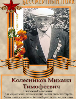 Колесников Михаил Ильич 1905 - 1981 Колесников Михаил Калинович 1909 - 1945 Колесников Михаил Калинович Родился 22 июня 1922 года в селе Кугей Азовского района Ростовской области 1922 - 1974 Колесников Михаил Мефодьевич 1924 - 2009 Колесников Михаил Митрофанович село Алексеевка Корочанского района Курской области 1915 Колесников Михаил Михайлович 1922 - 1943 Колесников Михаил Михайлович Воронежская обл. 1922 - 1943 Колесников Михаил Михайлович Воронежская область 1922 - 1943 Колесников Михаил Николаевич 1910 - 1993 Колесников Михаил Николаевич д. Ст.Белогузка Вятско-Полянского района Кировской области 1920 - 1977 Колесников Михаил Николаевич 1910 - 1980 Колесников Михаил Николаевич деревня Шалага Кикнурской волости Яранского уезда Вятской губернии 1925 - 2010 Колесников Михаил Николаевич Кировская область, Санчурский район, д. Колотово 1911 - 2001 Колесников Михаил Осипович 1921 - 1971 Колесников Михаил Павлович с.Перекоповка Глинского района Сумской области 1921 - 1998 Колесников Михаил Пантелеевич 1925 - 1992 Колесников Михаил Петрович станица Терская Моздокского района СОАССР 1923 - 2015 Колесников Михаил Сергеевич с.Богородицкого, Чернавская волость, Скопинский уезд, Рязанская губерния 1923 - 1993 Колесников Михаил Тимофеевич 1908 - 1989 Колесников Михаил Тимофеевич город Красный Сулин 1910