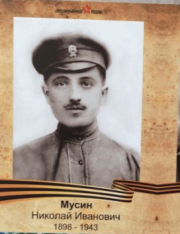 Мусин Мухаметфат Фатыхович 1925 - 2012 Мусин Мухтар Бикмухаметович 1905 - 1983 Мусин Нагим Хисамутдинович Мусин Нигмат Хабибуллович 1926 - 1996 Мусин Низамутдн Хуснулгатаевич 1921 - 1975 Мусин Николай Иванович 1898 - 1943 Мусин Нургали Алимович д. Бездна, Дрожжановский район 1926 - 2022 Мусин Нургали Хабурович 1921 - 1994 Мусин Рахим Муслимович 1923 - 1976 Мусин Рашит Садыкович д. Туктагулово Баймакского района Республики Башкортостан 1924 - 1994 Мусин Ризатдин Мирсаяфович 1907 - 1987 Мусин Руз-Мухаммед Закирович 1920 - 1998 Мусин Сабир Ахметович 1925 - 1967 Мусин Сайфутдин Мусинович 1917 - 1993 Мусин Салават Канипович 1926 - 2002 Мусин Салих Гайсиевич 1919 - 1942 Мусин Семён Григорьевич с. Бессоновка Бессоновский район Пензенская область 1912 - 1996 Мусин Сулейман Мусинович Республика Татарстан, село Малые Кибя-Кози 1926 - 2008 Мусин Султан Сафеевич 1923 Мусин Султангали Сабитович 1913 - 2000