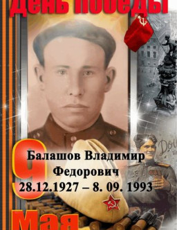 Балашов Владимир Васильевич 1923 - 2005 Балашов Владимир Григорьевич деревня Пикалево Владимирской области 1926 - 2003 Балашов Владимир Иванович Воронежская обл. Терновский район д. Кисельное 1923 - 1945 Балашов Владимир Кириллович Балашов Владимир Лаврович 1923 - 2000 Балашов Владимир Максимович 1925 - 2008 Балашов Владимир Михайлович Ярославская обл., Рыбинский р-н, с. Глебово 1916 Балашов Владимир Степанович 1912 - 2000 Балашов Владимир Тимофеевич 1903 Балашов Владимир Фёдорович 1927 - 1993 Балашов Гавриил Матвеевич 1900 - 1965 Балашов Георгий Алексеевич 1914 - 1982 Балашов Георгий Михайлович 1915 - 1993 Балашов Герман Леонидович Костромская область, с. Ильинское 1913 Балашов Григорий Андреевич 1902 - 1942 Балашов Григорий Иванович 1910 Балашов Григорий Иванович Балашов Григорий Константинович 1909 - 1941 Балашов Григорий Фёдорович Крым 1916 - 1993 Балашов Дмитрий Алексеевич 1915 - 1997