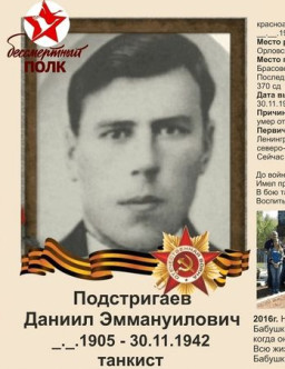 Подстрешный Влас Петрович 1898 - 1943 Подстрешный Дмитрий Власович село Шаблиевка Сальского района Ростовской области 1921 - 1943 Подстригаев Даниил Эмануилович 1905 - 1942 Подстригаев Даниил Эммануилович 1905 - 1942 Подстригаев Даниил Эммануилович 1905 - 1942 Подстрижень Дмитрий Иванович г.Краснодар,Краснодарский край 1923 - 2005 Подсухин Иван Яковлевич 1902 - 1977 Подсухин Иван Яковлевич 1902 - 1977 Подсухин Иван Яковлевич 1903 - 1977 Подсухин Семен Семёнович Костромская область, Вохомский район 1926 - 1976 Подсыпанин Геннадий Васильевич 1925 - 1988 Подтележников Иван Иванович 1906 - 1990 Подтележников Михаил Григорьевич 1912 - 1989 Подтелков Владимир Иванович 1924 - 1964 Подтергера Анатолий Иванович Черниговская область 1919 - 1987 Подтергера Василий Константинович 1910 - 1991 Подтергера Леонид Иванович Черниговская область, с.Яновка 1921 - 2000 Подтеребков Александр Павлович 1921 - 2008 Подтеребов Алексей Никифорович Подтероб Петр Григорьевич 1899 - 1991