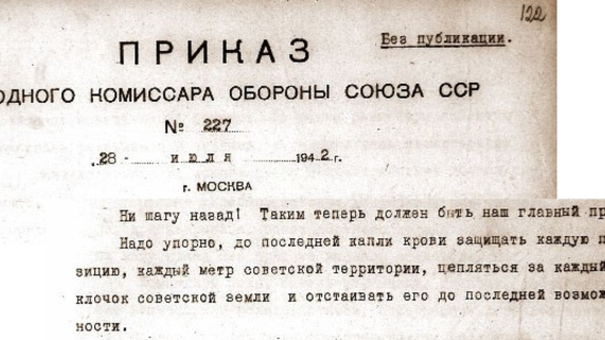 «Население нашей страны, с любовью и уважением относящееся к Красной Армии, начинает разочаровываться в ней, а многие из них проклинают Красную Армию за то, что она отдает наш народ под ярмо немецких угнетателей, а сама утекает на восток. Пора закончить отступление. Ни шагу назад! Таким теперь должен быть наш главный призыв, - говорилось в приказе. – После своего зимнего отступления немцы для восстановления дисциплины приняли суровые меры, приведшие к неплохим результатам. Они сформировали более 100 штрафных рот из бойцов, провинившихся в нарушении дисциплины по трусости или неустойчивости, поставили их на опасные участки фронта и приказали им кровью искупить свои грехи. Они сформировали специальные отряды заграждения, поставили их позади неустойчивых дивизий и велели им расстреливать на месте паникеров в случае попытки самовольного оставления позиций и в случае попытки сдаться в плен. Не следует ли нам поучиться в этом деле у наших врагов, как учились в прошлом наши предки у врагов и одерживали потом над ними победу?»