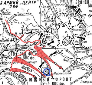 Германская группа армий "Юг", в составе 1-й танковой группы, 6-й и 17-й полевых армий, а также 4-го воздушного флота (всего 40 дивизий, включая 10 танковых и моторизованных), стремилась преодолеть рубеж укреплённых районов и достичь Киева, захватив плацдарм к югу от Днепра. Одновременно танковые и моторизованные части противника, нацеливаясь с севера на юго-восток, планировали окружить и уничтожить основные силы Юго-Западного фронта на Правобережной Украине. К началу операции германские силы превосходили советские войска в пехоте и артиллерии в 2 раза, в танках – в 1,1, и в боевых самолётах – в 2,8 раза.