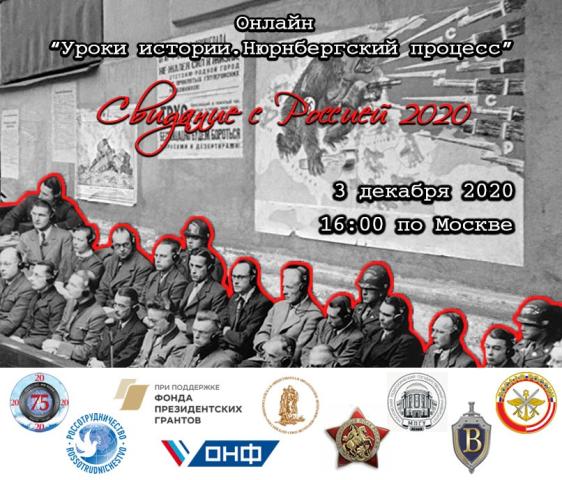 3 декабря 2020 года в 16.00 по московскому времени Международный медиапроект «Свидание с Россией» при поддержке Россотрудничества, Фонда Президентских грантов, Федерального агентства по делам национальностей, ОНФ, Бессмертного полка России, Российского союза ветеранов, ДОСААФ, Российского союза молодёжи, Ассоциации «Группы «Вымпел» проводит первый международный онлайн-урок истории «Нюрнбергский процесс».