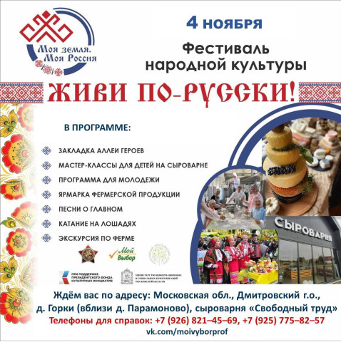 В День народного единства, 4 ноября, в Дмитровском городском округе Подмосковья пройдёт Фестиваль народной культуры «ЖИВИ ПО-РУССКИ!» Масштабное мероприятие, организованное в рамках проекта «Моя земля. Моя Россия» региональным отделением ООД «Бессмертный полк России» в Московской области и АНО «Мой выбор», пройдет на территории крестьянско-фермерского хозяйства и сыроварни «Свободный труд».